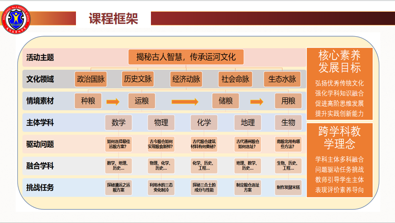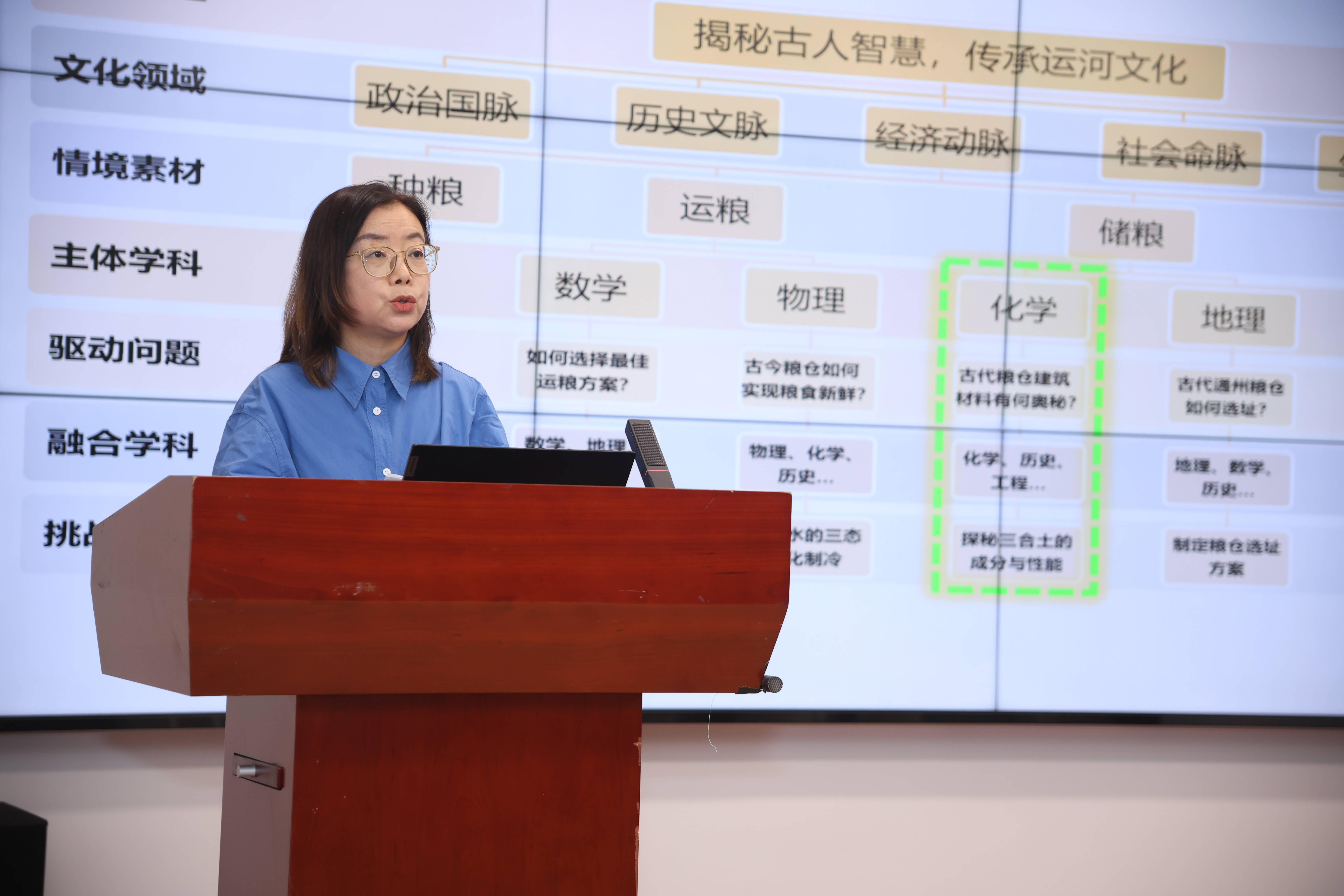 本次会议主要展示第一批教学成果。五个跨学科实践活动围绕“古代通州粮仓”主情境展开,以“种粮——运粮——储粮——用粮”为主线,以“运粮方案(数学-陈鹏举指导)”“粮仓选址(地理-曾早早指导)”“粮仓建材(化学-王钦忠指导)”“保鲜密码(物理-丁友福指导)”“南粮北用(生物-徐扬指导)”等真实情境为切入点,各学科在坚持以本学科为主的前提下,通过问题驱动和任务挑战融入其他学科知识,让学生在实践中感悟古人科技智慧,深化对大运河文化的认同感与自豪感。