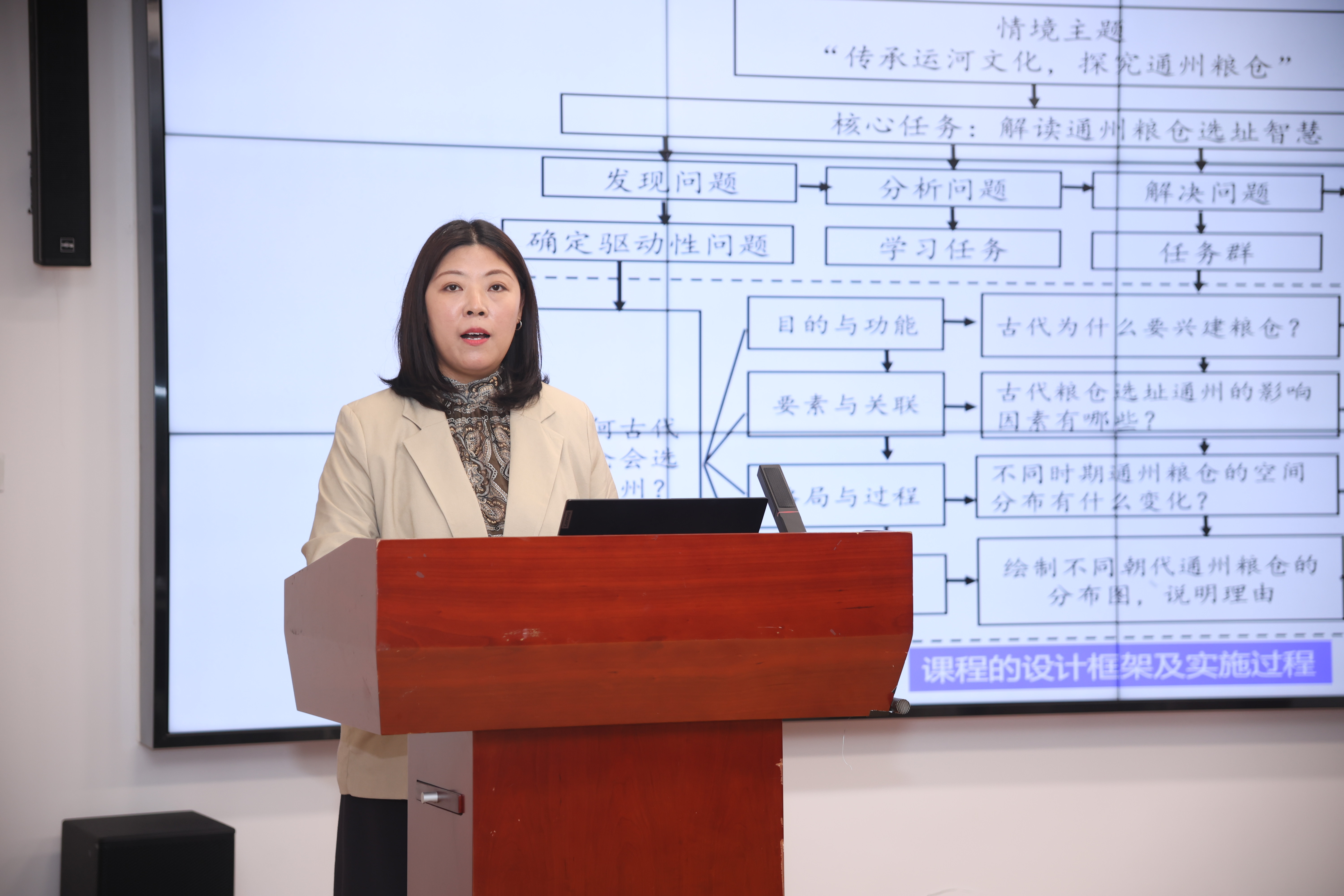 地理学科顾欢欢老师的《探究通州粮仓选址智慧》,打破单一学科界限,融合历史、数学与物理思维,带领学生从区域联系、水文特征、军事防御等多维度分析粮仓选址动因与空间变迁,在实地考察与地图绘制中深化区域认知、培养综合思维。