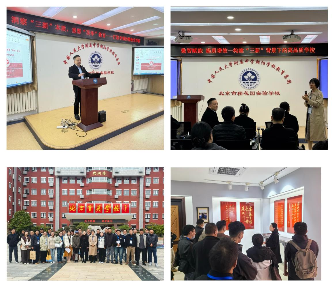 三、学校参访:走进名校,观摩实践取真经 “纸上得来终觉浅,绝知此事要躬行。”为了让学员们获得更为直观的感受,项目组安排了北京知名中小学参访活动。学员们走进了北京育英学校、北京市樱花园实验学校,以“传承红色基因 担当育人使命”“‘三新’背景下校长教学领导力提升”为主题,玉树州学员们与北京校长面对面交流管理经验,实地考察了学校的文化建设、社团活动和智慧校园应用。