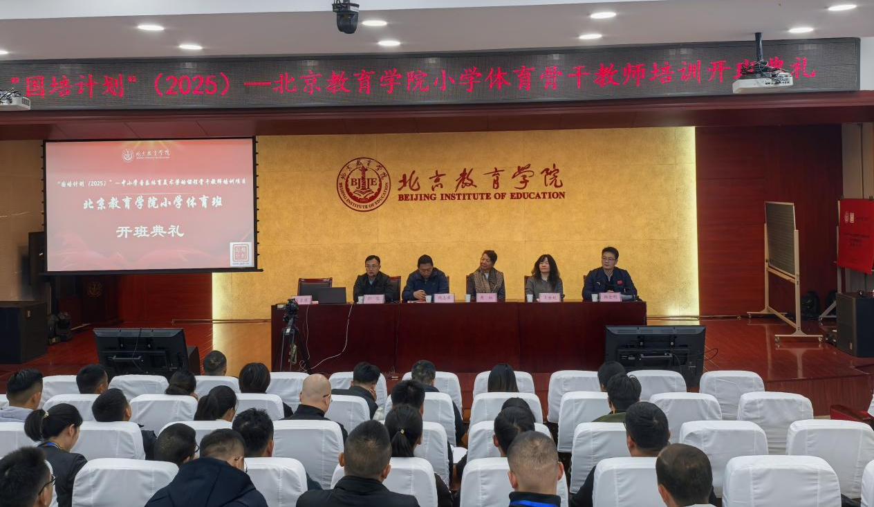 2025年10月29日上午,教育部“国培计划(2025)”小学体育骨干教师培训班开班典礼在北京教育学院黄化门校区博士园报告厅顺利举行。北京教育学院体育与艺术教育学院党总支书记周志勇、副院长韩金明、教务处综合管理科科长王冬妮、《学校体育杂志》编辑部主任郝俊、八一学校体育部主任/特级正高级教师黄虹、教务处项目负责人韩兵副教授、项目班主任易建斌、体育系教师刘娇博士出席,与来自全国各地31个省市自治区和新疆生产建设兵团的50名小学体育骨干教师共同参加典礼。典礼由韩金明副院长主持。
