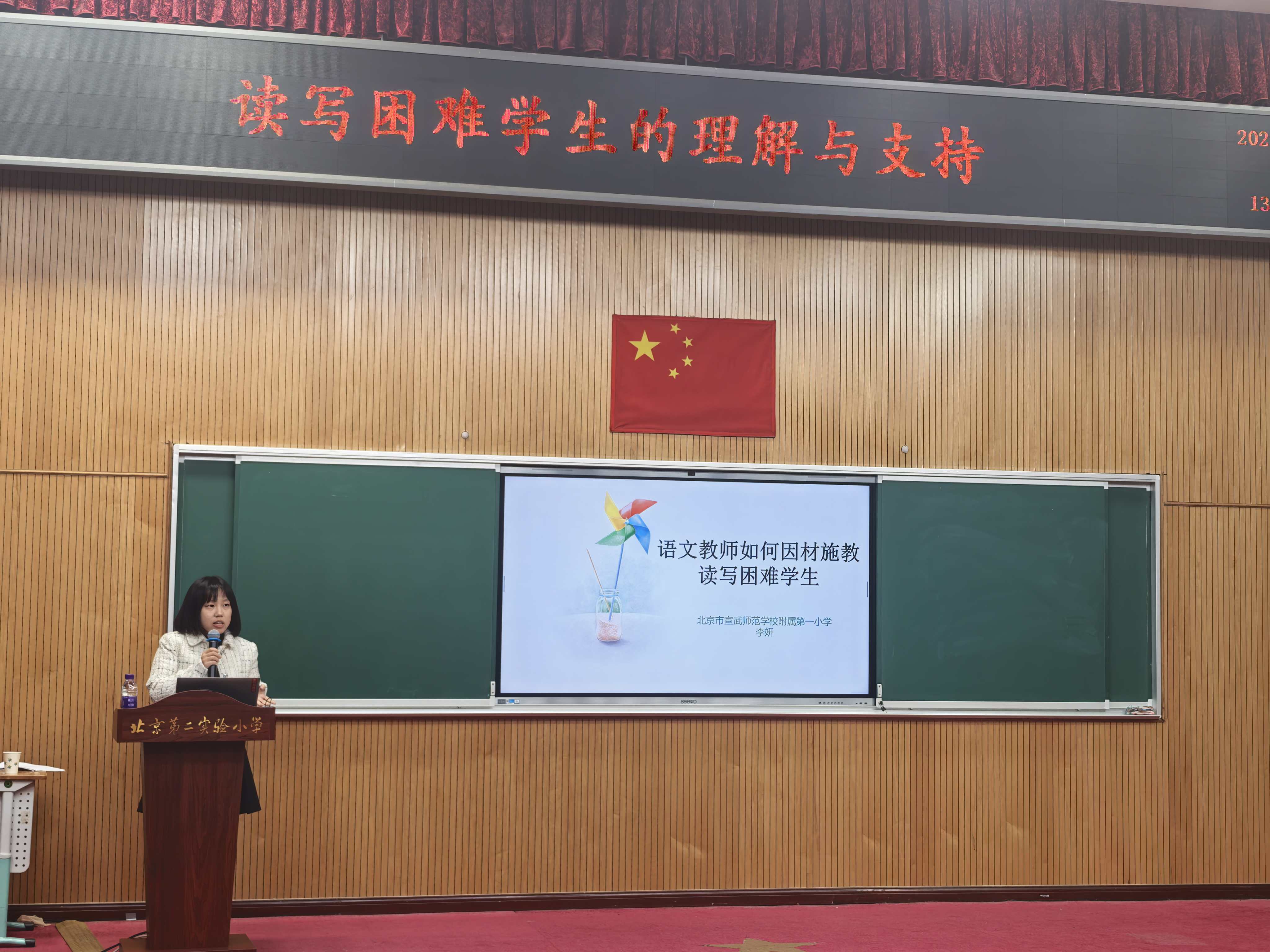 北京市宣武师范学校附属第一小学的李妍老师以《语文教师如何因材施教读写困难学生》为题,聚焦学科教师对读写困难学生的学情分析与因材施教实践,展现了其专业成长与角色转变。