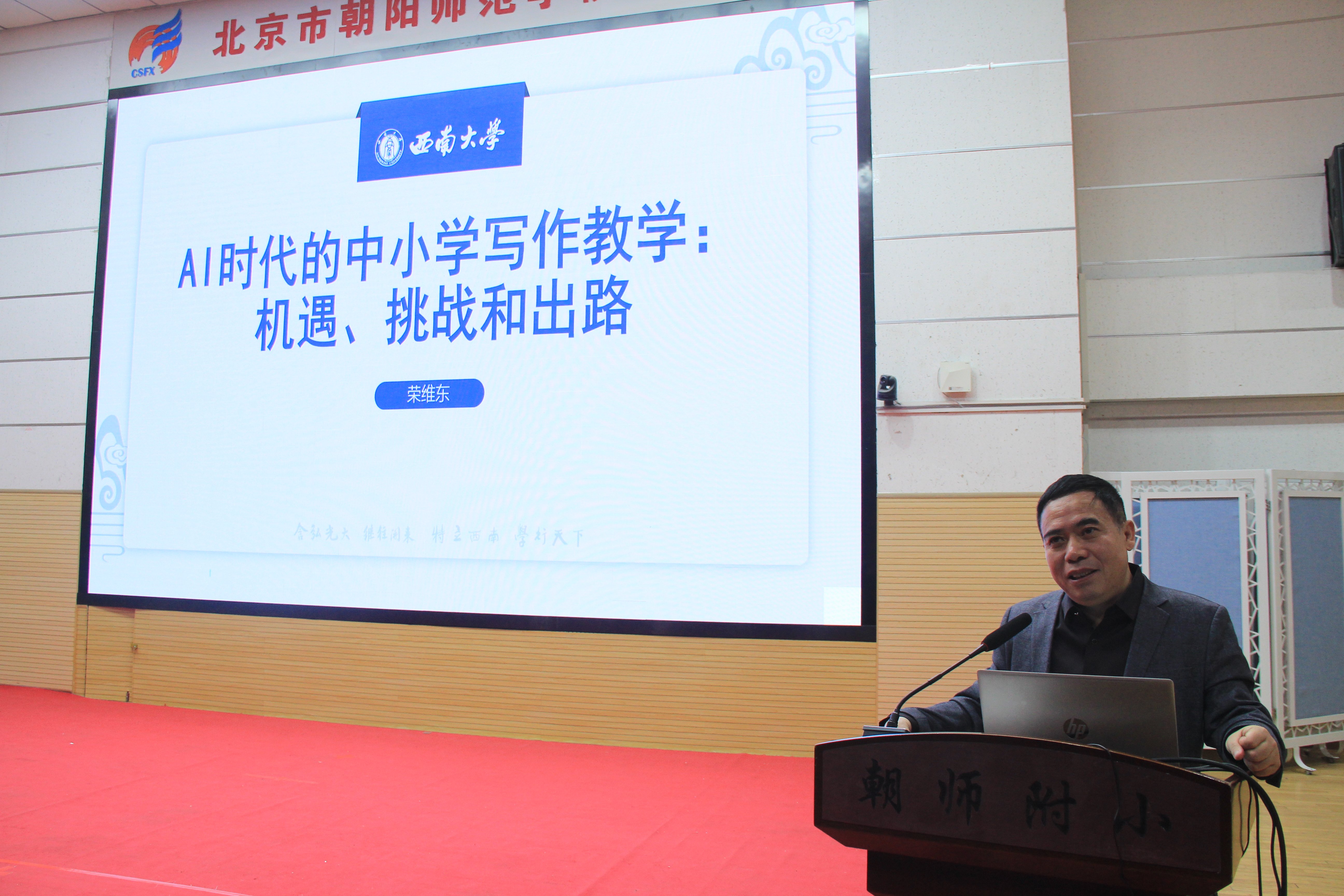 压轴环节,西南大学荣维东教授作了题为《人工智能时代写作教学挑战、机遇与对策》的专家讲座。他深刻剖析了AI给写作教学在评价方式、任务设计等方面带来的核心挑战,并提出了“工具性、辅助性、教育性”三大应用原则。荣教授强调,教育的终极目标不是培养“AI写手”,而是借助AI更好地发展学生的观察力、思考力和原创表达,引导写作教学奔赴“技术赋能、回归育人”的星辰大海。