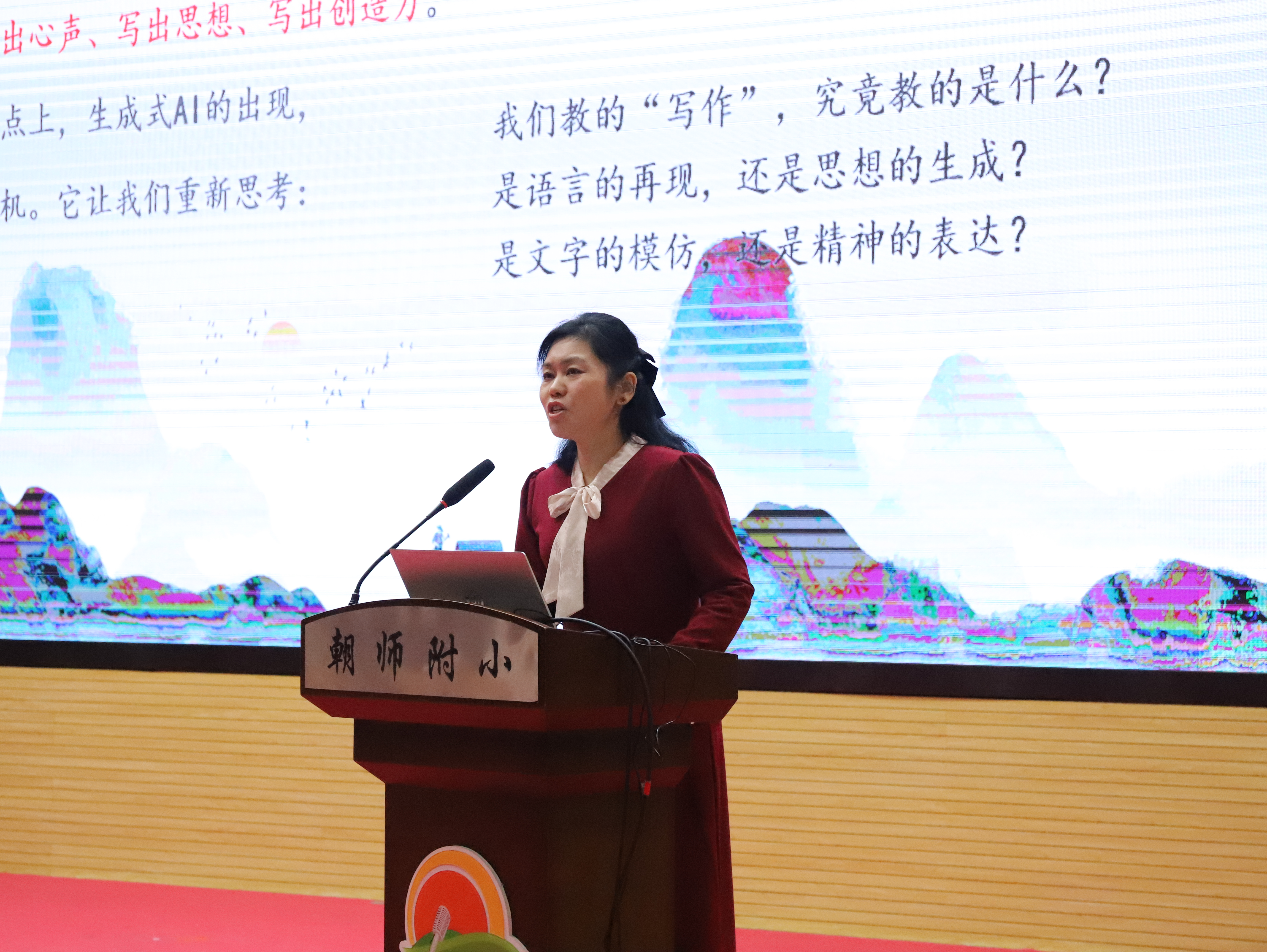 2025年11月6日上午,由北京教育学院人文与外语教育学院主办的第二届“培育读书种子”讲坛在北京市朝阳师范学校附属小学太阳星城校区隆重开幕。本届讲坛以“指向核心素养的写作教学”为主题,首场活动聚焦“生成式AI赋能作文教学的范式革新”,汇聚了来自全国多地的教育专家、教研员及一线教师,共同探讨人工智能时代写作教学的未来图景。