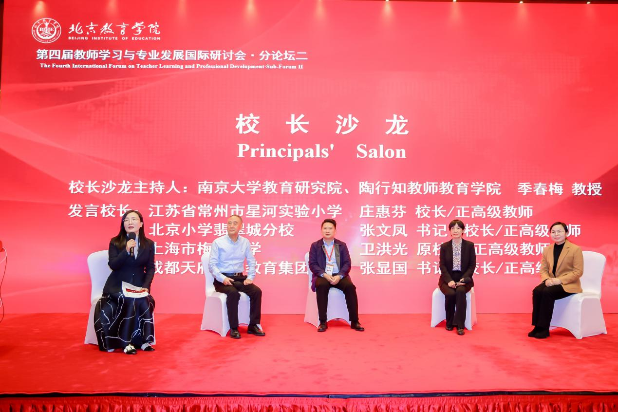 论坛的校长沙龙环节由南京大学教育研究院季春梅教授主持,江苏常州星河实验小学校长庄慧芬、北京小学翡翠城分校校长张文凤、上海梅陇中学原校长卫洪光、成都天府四中校长张显国参加。沙龙从当前传统教师队伍的结构与挑战切入,探讨了教师所面临的转型压力,技术赋能与认知风险、情感关怀的平衡,循证教学等热点话题,为学校层面的教师队伍建设提供了可借鉴的实践思路。