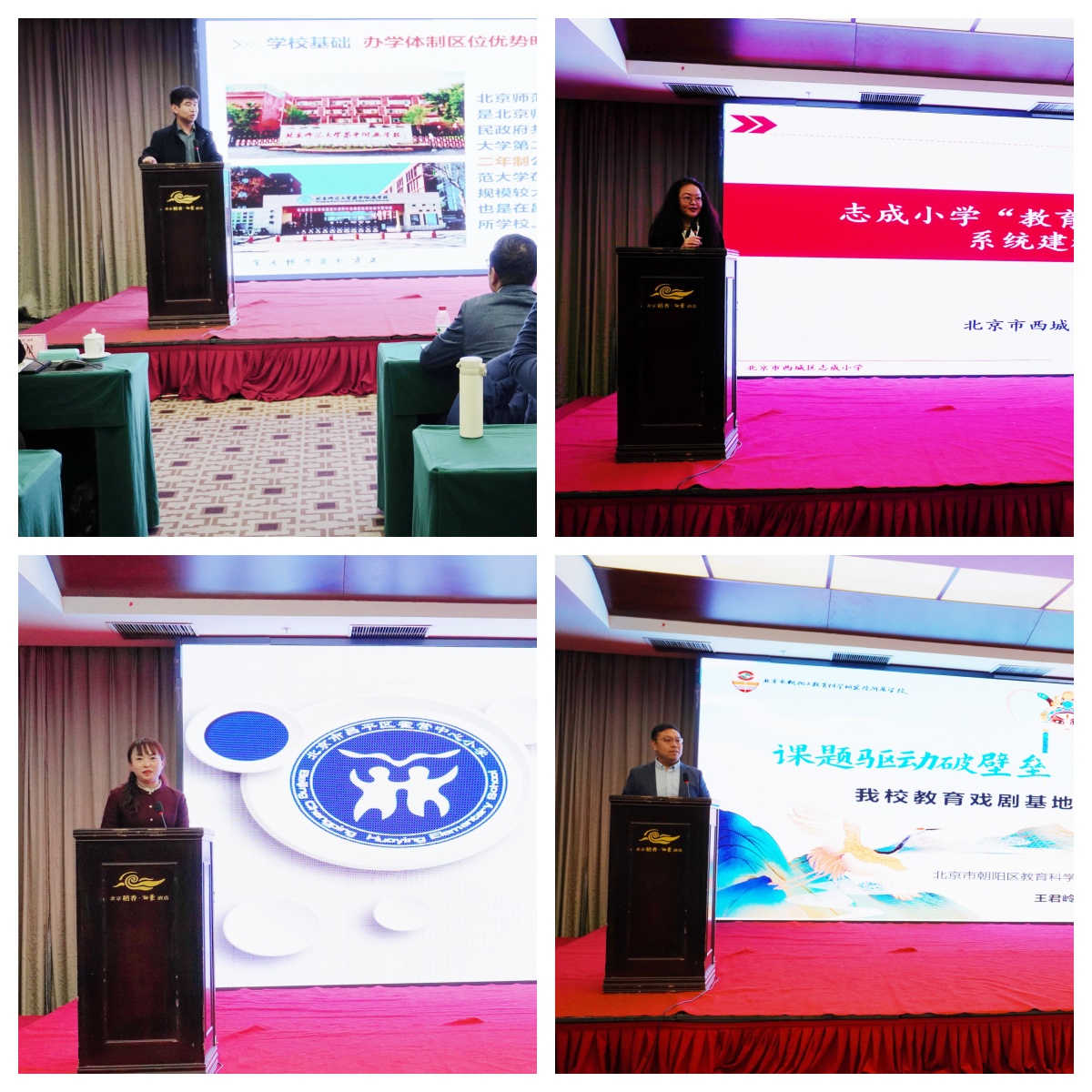“校长话教育戏剧 ”环节中,由北京教育学院人文与外语教育学院王秀荣老师主持,北京师范大学昌平附属学校、西城区志成小学、霍营中心小学、朝阳区教育科学研究院附属学校四所首批教育戏剧基地校的负责人分享了各自的探索历程与典型经验。北师大昌平附属学校展现了其从“戏剧课程建设 ”到“用教育戏剧讲好中华优秀传统文化 ”,再到“用‘大戏剧观 ’助力通用学习力培养 ”的三阶段发展路径。西城区志成小学重点介绍了以红领巾“润智课程 ”为依托,立足校情、融合创新的戏剧育人模式。霍营中心小学分享了其立足“和育 ”文化,将教育戏剧作为“天地人和 ”特色课程群核心组成部分的八年实践历程。朝阳区教育科学研究院附属学校则阐述了以课题为引领,构建“教师学习—课程设计—社团拓展—研讨交流 ”四位一体实践模式,实现从“活动 ”到“课程 ”蜕变的系统经验。