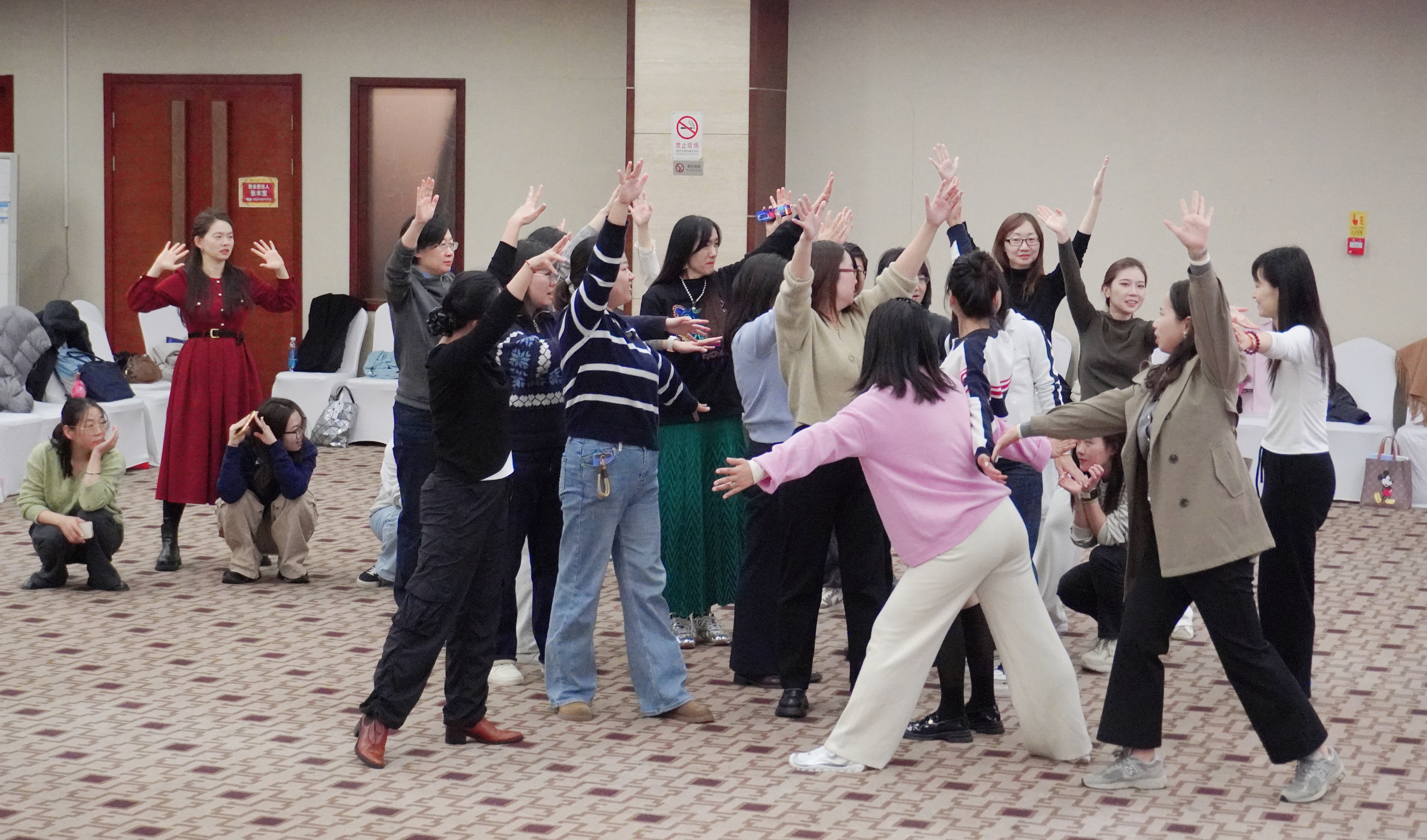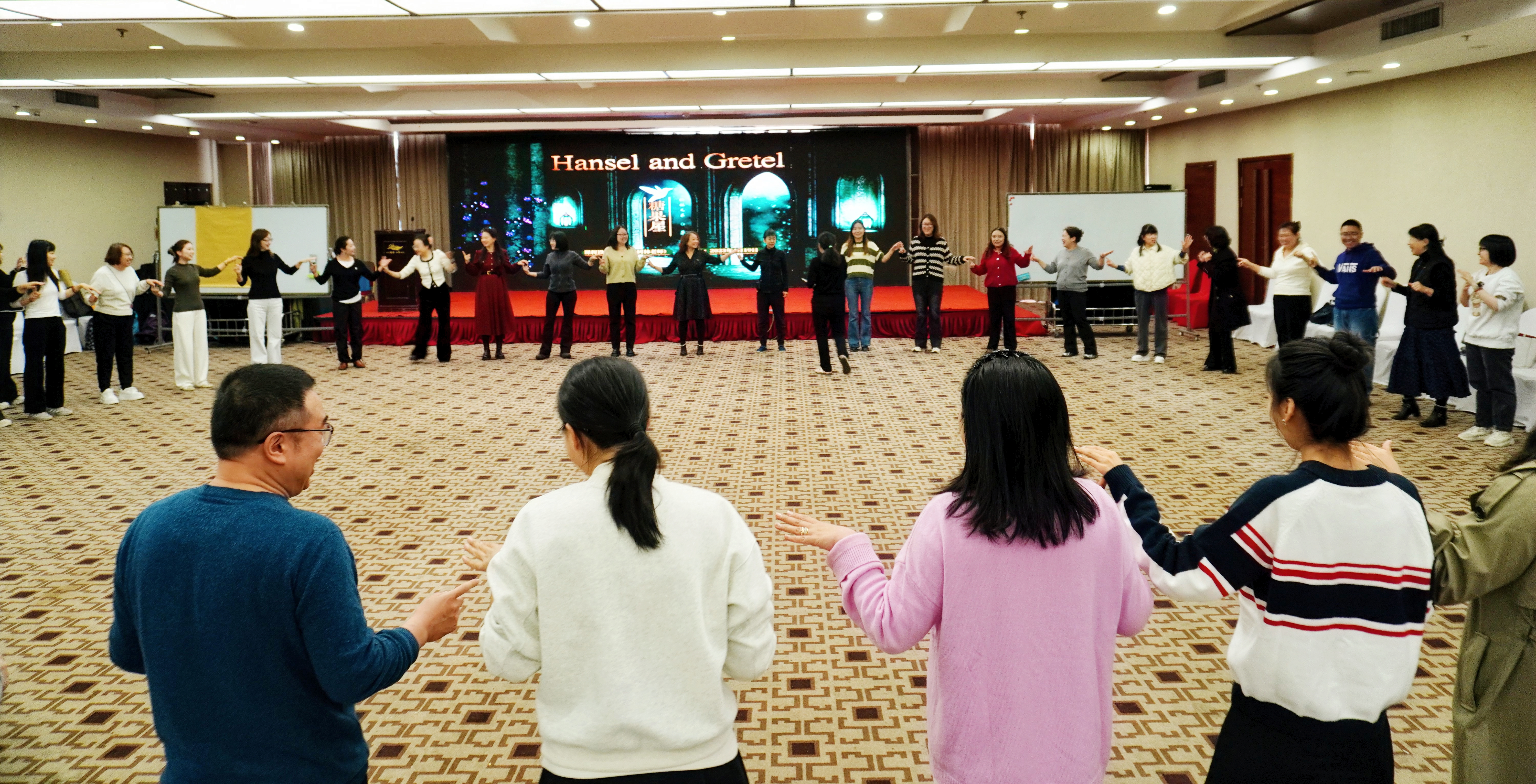 研讨会上,还组织了实践体验环节——教育戏剧工作坊《糖果屋》 。工作坊由北京教育学院人文与外语教育学院柯丹老师与中国戏剧文学学会林航老师共同带领。工作坊以经典童话为蓝本进行创新改编,旨在通过半沉浸式的教育戏剧活动,引导参与者在“欲望与诱惑—选择与责任—现实与成长 ”的故事情境中,进行深度体验与反思。课程总目标明确指向情感共鸣、思维激发与价值觉醒。 在具体实施中,工作坊巧妙运用彩布、方巾、标志物等简易道具,创设出充满想象力的戏剧情境。在两位导师的层层引导下,参与者通过角色体验、情境对话、集体建构等戏剧习式,不仅实现了专注力、表达能力、创造性想象与合作精神等学习力目标,更深刻地体验了不同角色的处境与情感,感受了自由、诱惑与现实、责任之间的内心冲突,并最终在引导下对“幸福的真意 ”、“无忧世界的代价 ”以及“成长中努力与付出的意义 ”进行了深入的集体反思。 整个工作坊气氛热烈,互动频繁。参与者纷纷表示,这种“在做中学、在体验中思 ”的模式,让他们对教育戏剧的核心理念与实践方法有了更直观和深刻的理解,为日后在各自教学岗位上开展教育戏剧活动提供了宝贵的思路与灵感。