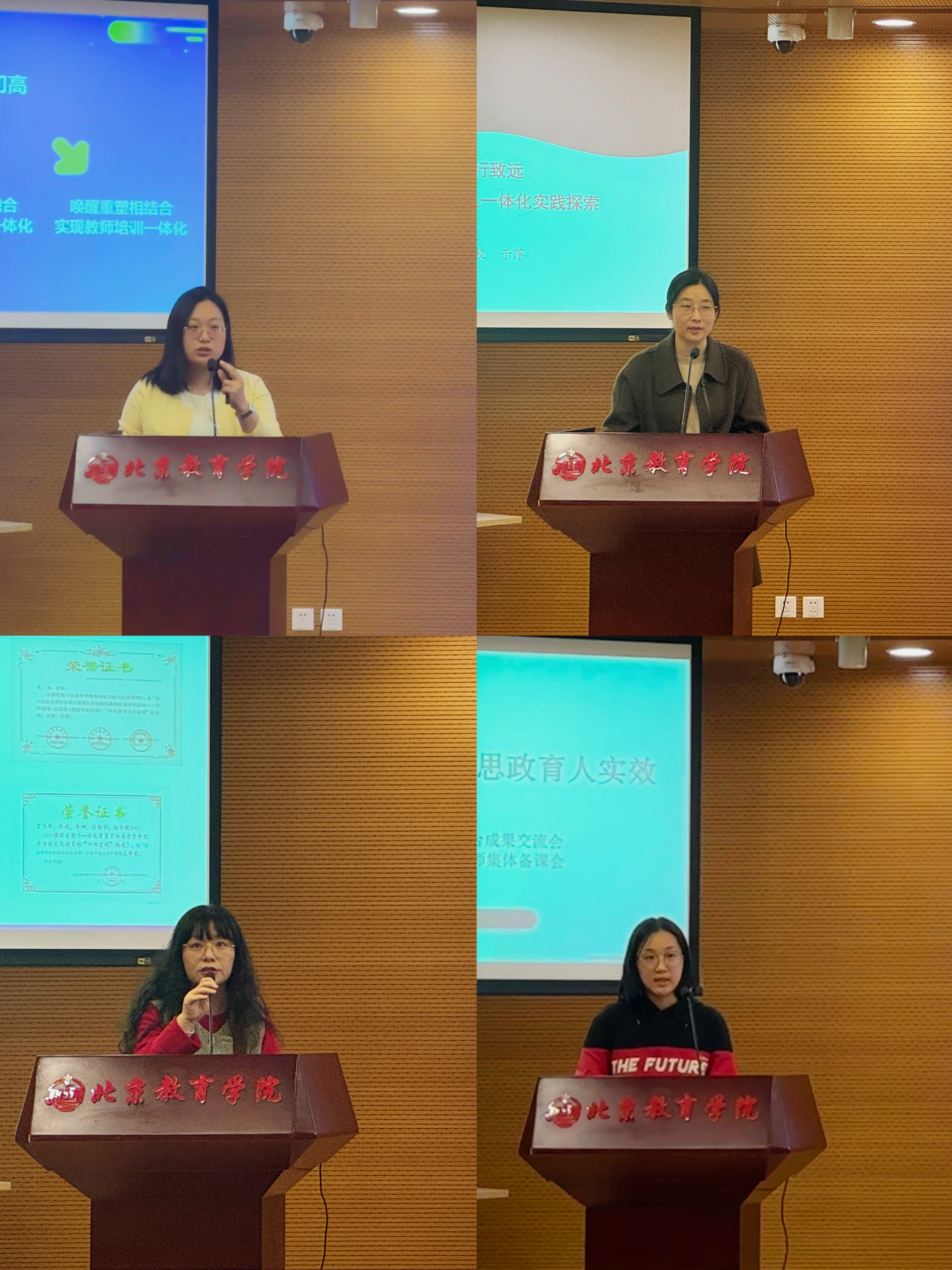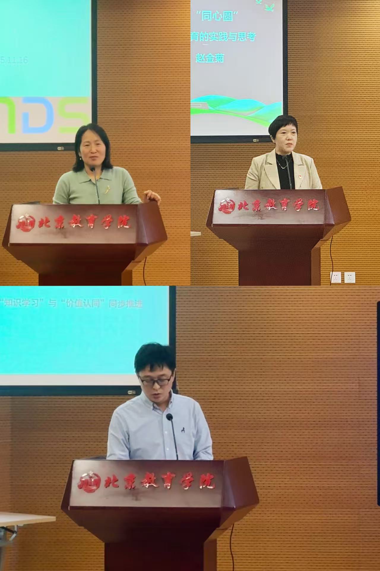 在集体备课基地校分享环节,来自北京陈经纶中学的盖梦洁、人大附中石景山学校的于萍、首师大附中通州校区的薛超、史家胡同小学的王艳冰、北京十一学校的周永霞、大兴区兴华学校的赵金菊、熊儿寨中心小学的郭海清七位基地校代表结合本校实践,围绕贯通育人、体系构建、课程开发、学科德育、实践浸润、资源融通等方面分享了思想政治教育一体化建设的创新成果与宝贵经验。交流中,与会教师一致认为,应以“课程一体化”打破学段壁垒,以“社会大课堂”促进认知升华,以“数字赋能”重塑教学形态,切实提高思想政治教育的针对性、感染力。