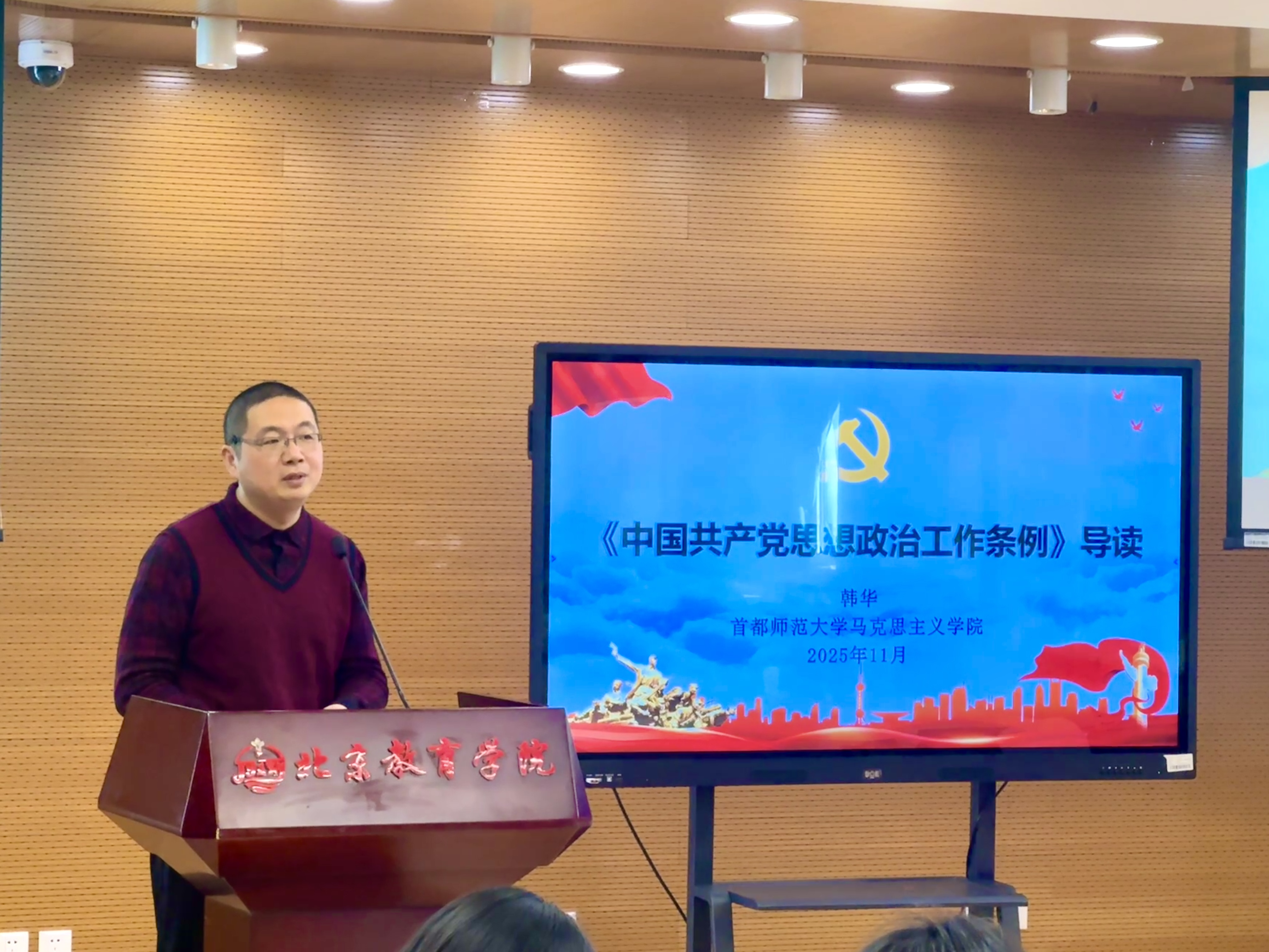 韩华教授结合党的二十届四中全会精神,对《中国共产党思想政治工作条例》进行了系统阐释和深入解读。一是深刻阐释了《条例》的重大意义与核心内容。他梳理了《条例》制定的时代背景、核心要义与整体框架,深刻阐释了其作为新时代思想政治工作根本遵循的重大意义,重点解读了《条例》在确立思想政治工作“生命线”地位、坚持和加强党的全面领导、推动习近平新时代中国特色社会主义思想凝心铸魂等方面的核心规定。二是系统解读了《条例》的实践要求与落实路径。韩华教授全面阐释了各领域思想政治工作的任务要求、队伍建设标准与保障监督机制,构建了完整的制度体系。针对学校思想政治教育,《条例》特别强调要推进大中小学思想政治教育一体化建设,推动全员、全程、全方位育人,培养德智体美劳全面发展的社会主义建设者和接班人。