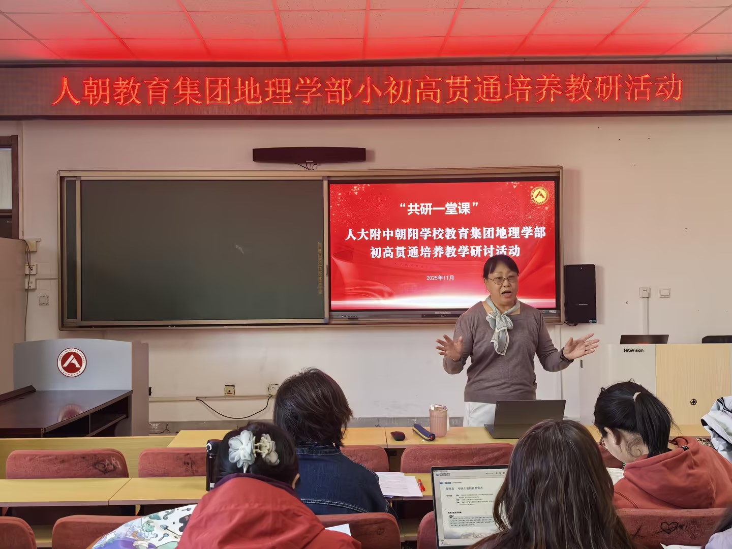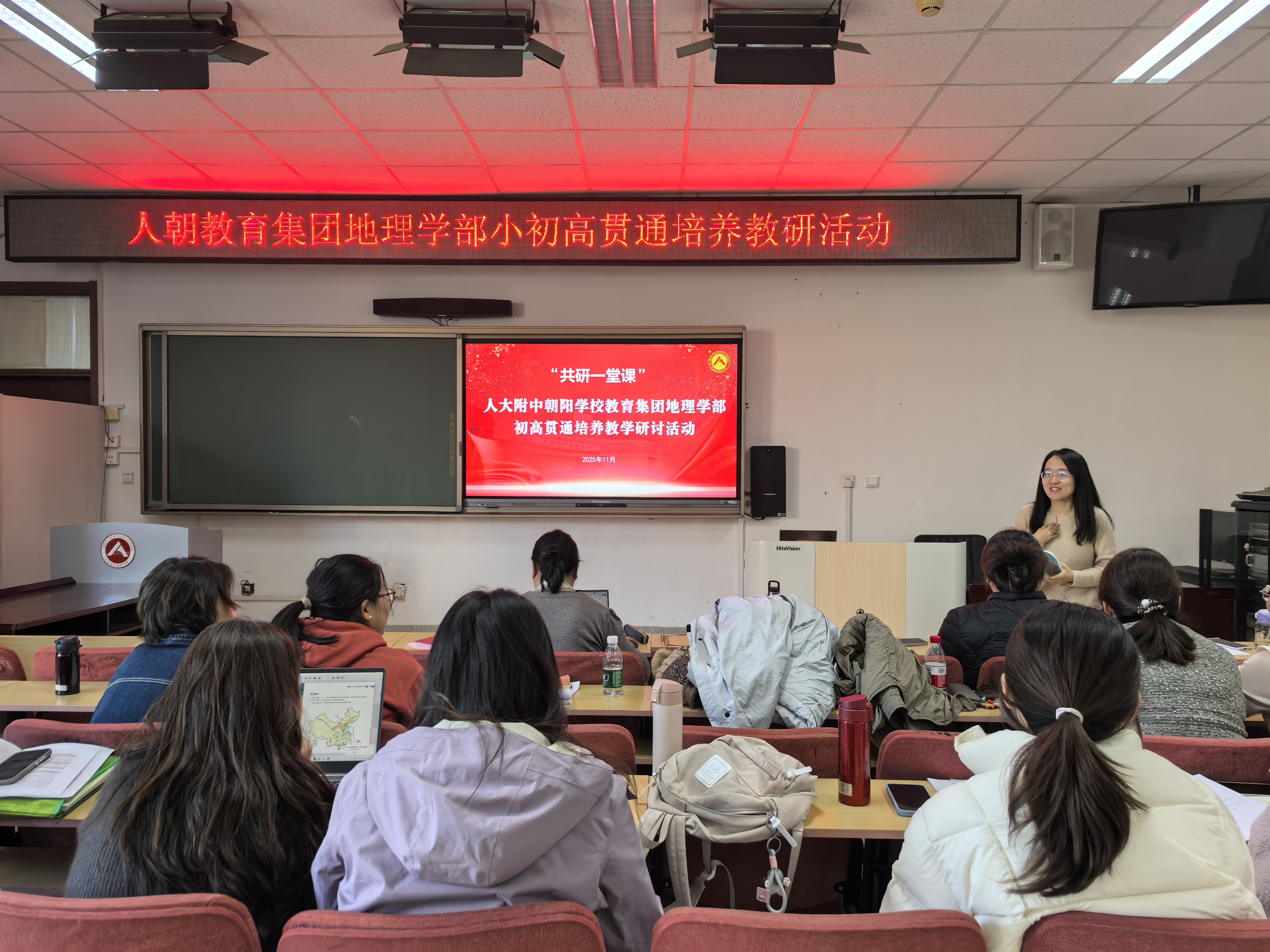 11月13日, “优秀青年教师素质提升研修项目”初中地理班在中国人民大学附属中学朝阳学校成功举办了线下实践研讨活动。本次活动以“优化地理课程内容结构,提升学科育人实践能力”为核心主题,聚焦素养导向的课堂教学实践,通过“研修项目+区域教研”双轮驱动模式,推动初高中地理教学的有机衔接与深度融合。活动由人大附中朝阳学校初中地理教研组长朱丽明老师主持。
