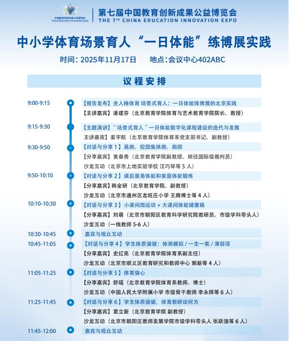 11月17日上午9:00-12:15,北京市中小学体育场景育人“一日体能”学练展分论坛,在珠海国际会展中心B座四层402ABC举行。通过成果发布、主旨演讲、教学展示与交流分享等形式,深入探讨体育场景育人学生一日体能学练的创新实践。