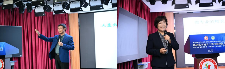 20日下午为“揭牌助航”的导师讲堂环节。汤丰林教授以《教育强国背景下校长的领导力》为题,从领导力层级、学校环境营造、教师队伍建设等维度,明晰校长履职核心;胡淑云教授以《做专业的校长,办朴实的教育》为题,解析“朴实教育”等常见概念的内涵,指引校长要做专业的校长,不要做业余的校长,回归教育本真。两场报告兼具理论高度与实践指导价值,为与会者带来深刻的专业启迪。