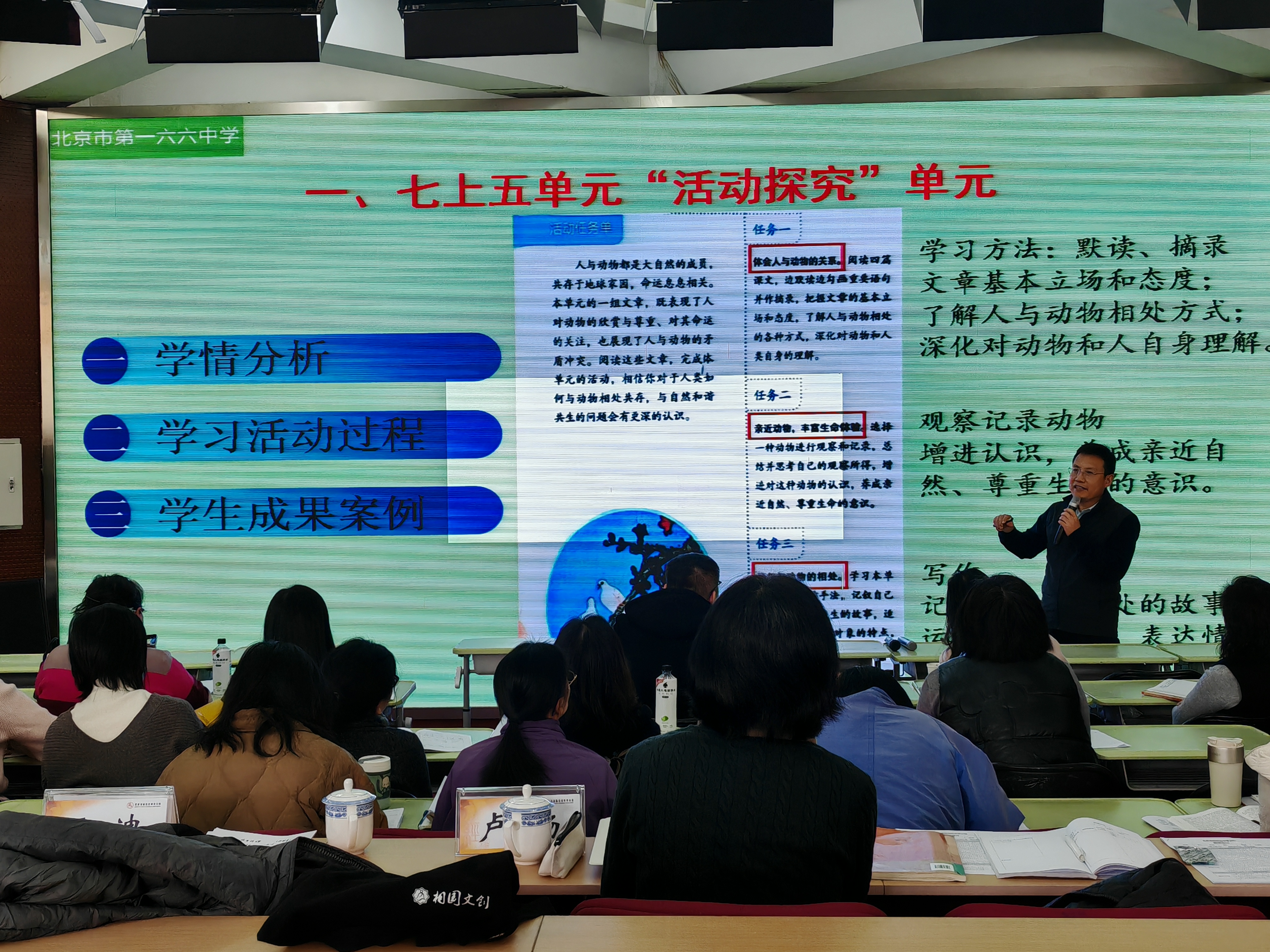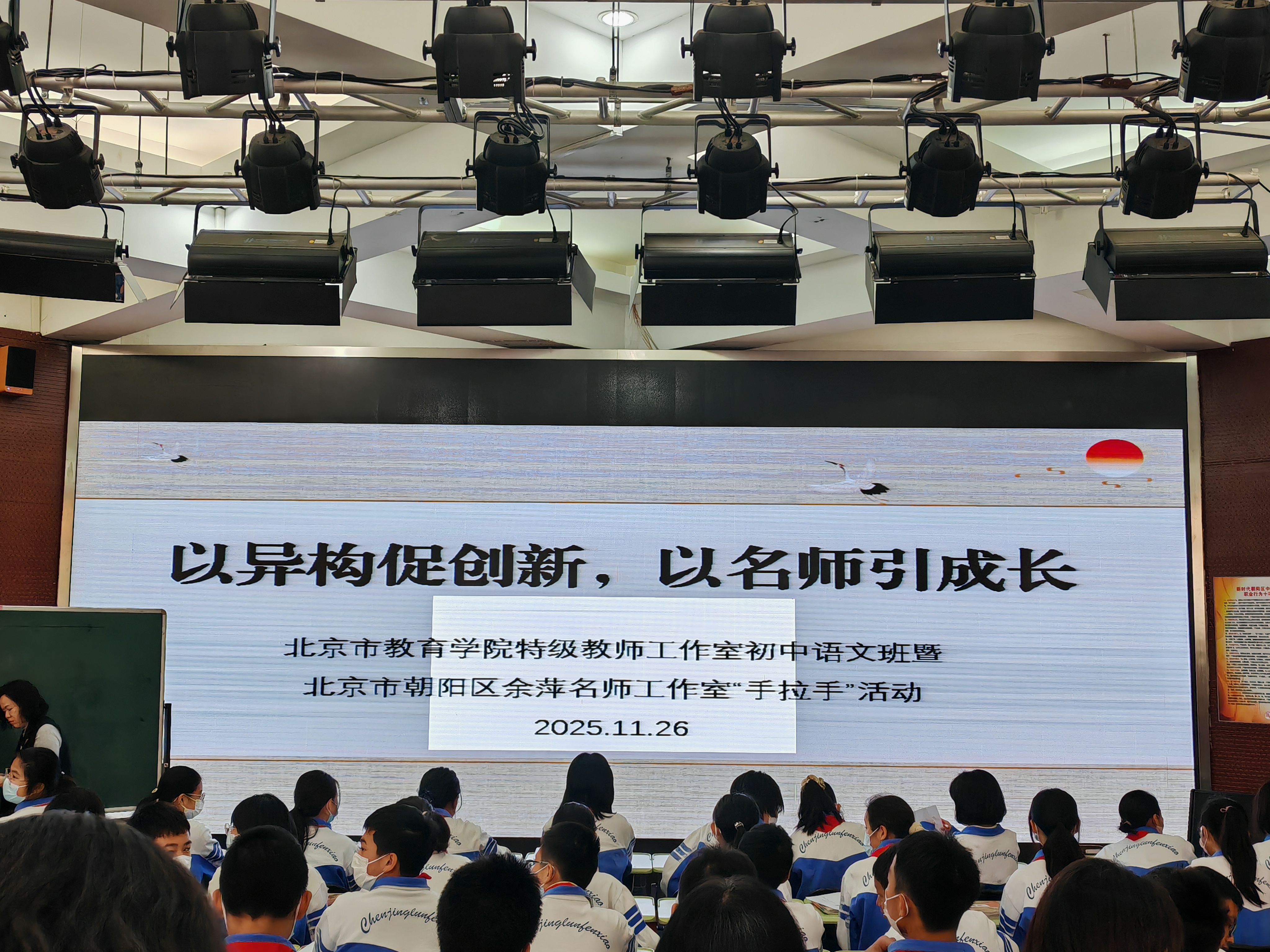 2025 年11月26日,由北京教育学院人文与外语教育学院卢杨老师负责的北京市 2024北京教育学院特级教师工作室(面向市骨)初中语文班与朝阳区余萍名师工作室开展“手拉手”活动在北京市陈经纶中学分校举行。本次活动聚焦语文古诗文教学实践、记叙文写作提质策略、整本书阅读教学创新等教研领域的重点方向与难点课题。对特级教师工作室而言,活动为市级骨干教师提供了扎根区域教学实际、检验教学策略的实践场景;对余萍名师工作室来说,也借助市级优质资源拓宽了区域教师的教研视野。双方通过“同课异构+专题研讨 ”的联动模式,有效探索了提升了初中语文教育教学质量,助力学科育人目标落地的方法和策略。