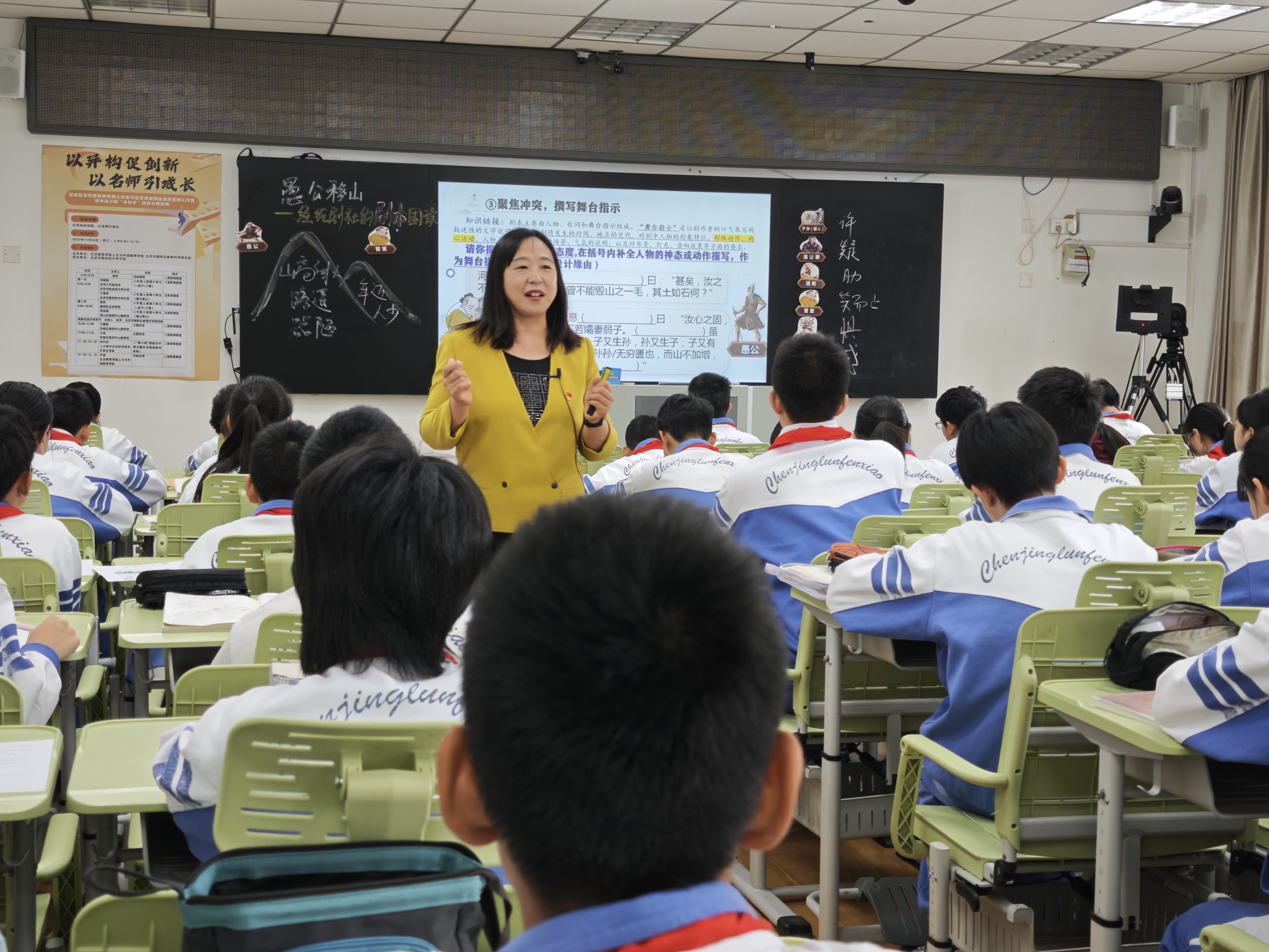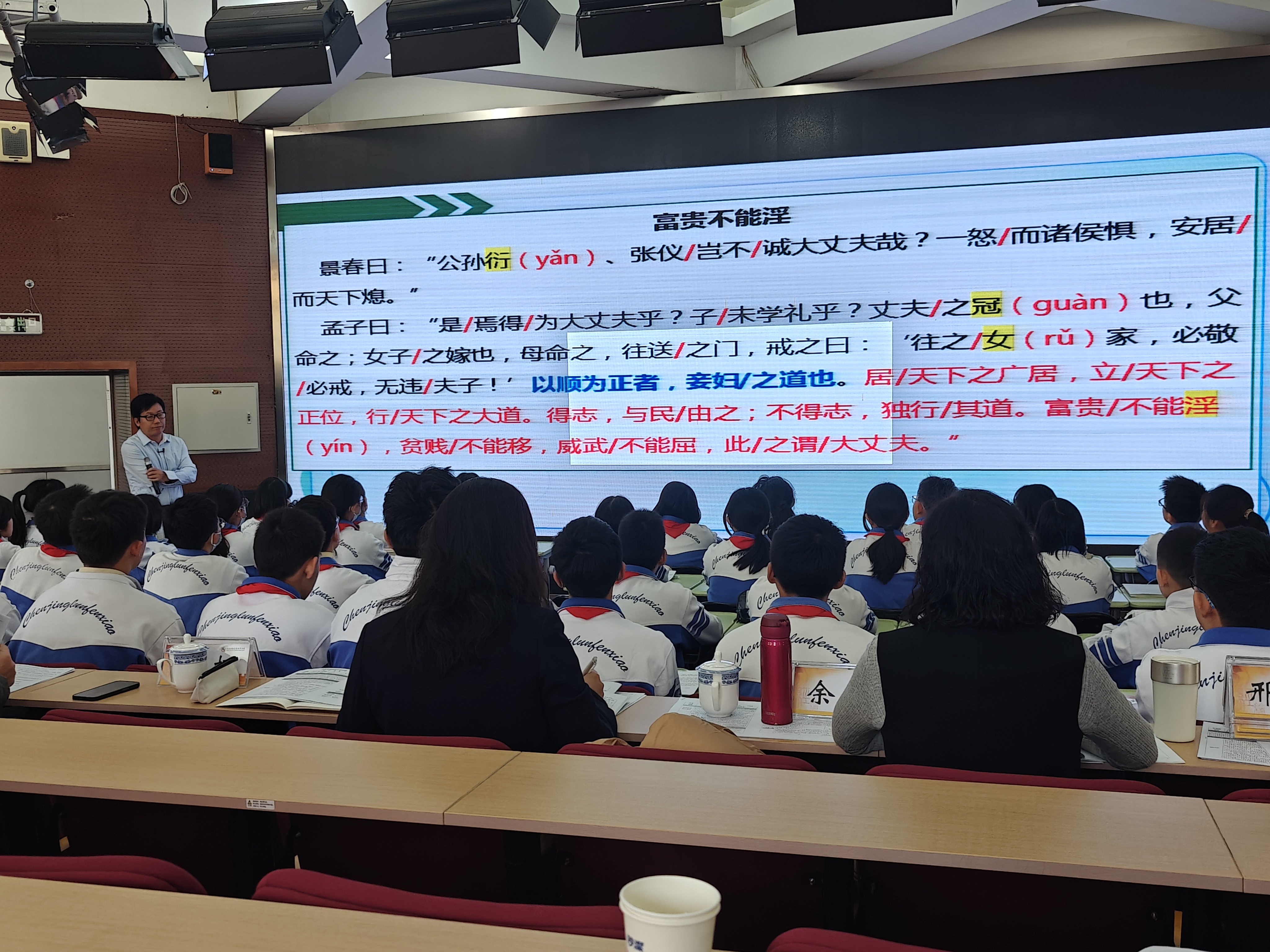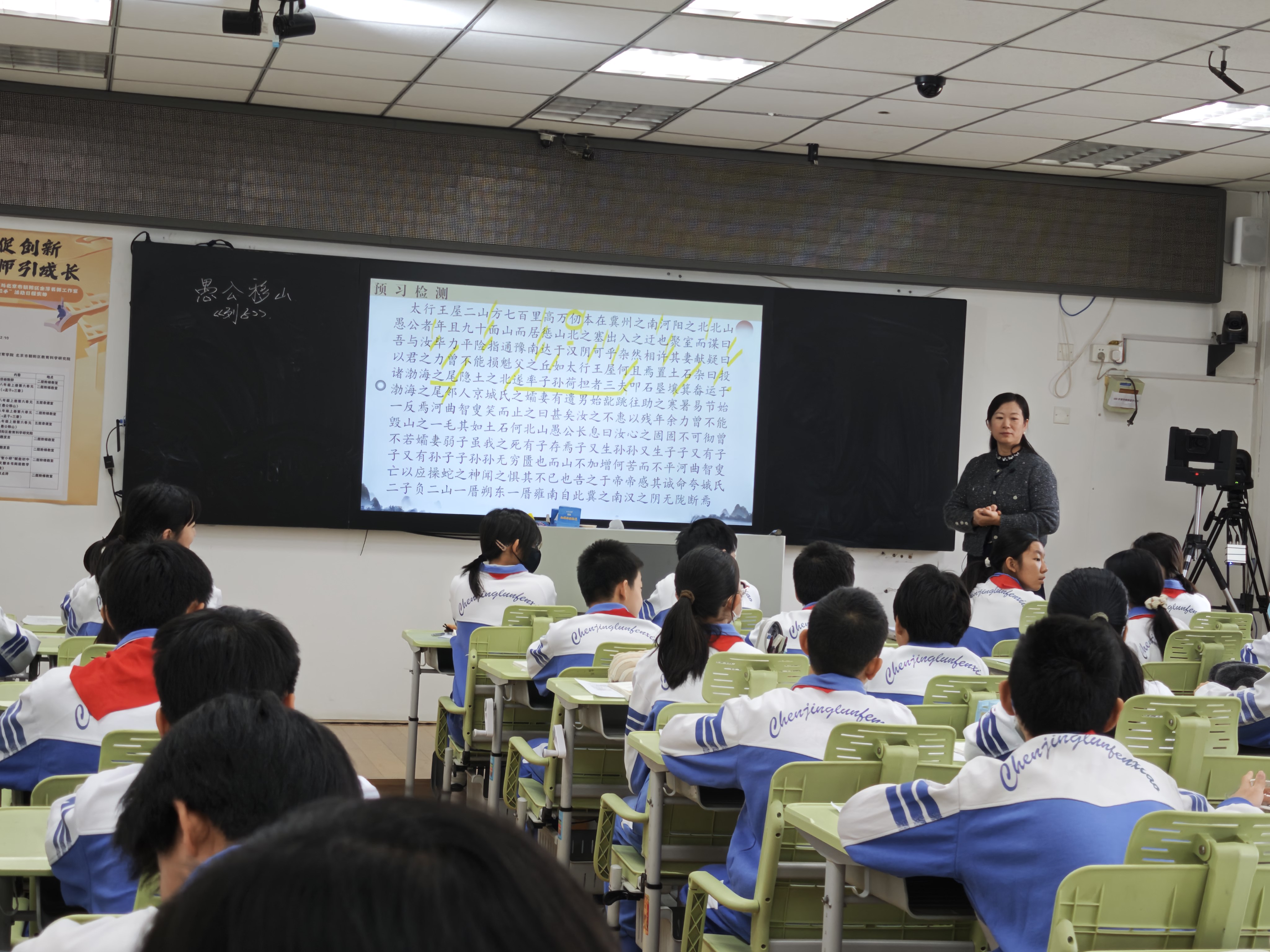 同课异构环节里,来自余萍工作室的刘丽娟、于春菲与特级教师工作室联动的张佑、刘宝艳等教师,分别围绕八年级上册《<孟子> 三章》《愚公移山》展开差异化授课,在二层阶梯教室与五层录课室形成“同课不同构、异构显特色”的教学研讨氛围。
