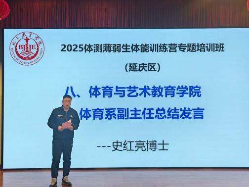 五、总结发言 体育系史红亮副主任代表项目团队做总结发言,首先对本次项目的圆满实施表示祝贺,对延庆区教师研修中心的大力支持、项目团队的辛勤付出及学员的积极参与表示感谢;强调了体测薄弱生体能提升工作在素质教育中的重要意义,鼓励全体学员以本次培训为契机,持续加强专业学习与教学研究,不断提升自身教学能力;最后表示北京教育学院将继续为区域体育教师提供专业支持,推动中小学体育教学质量的整体提升。