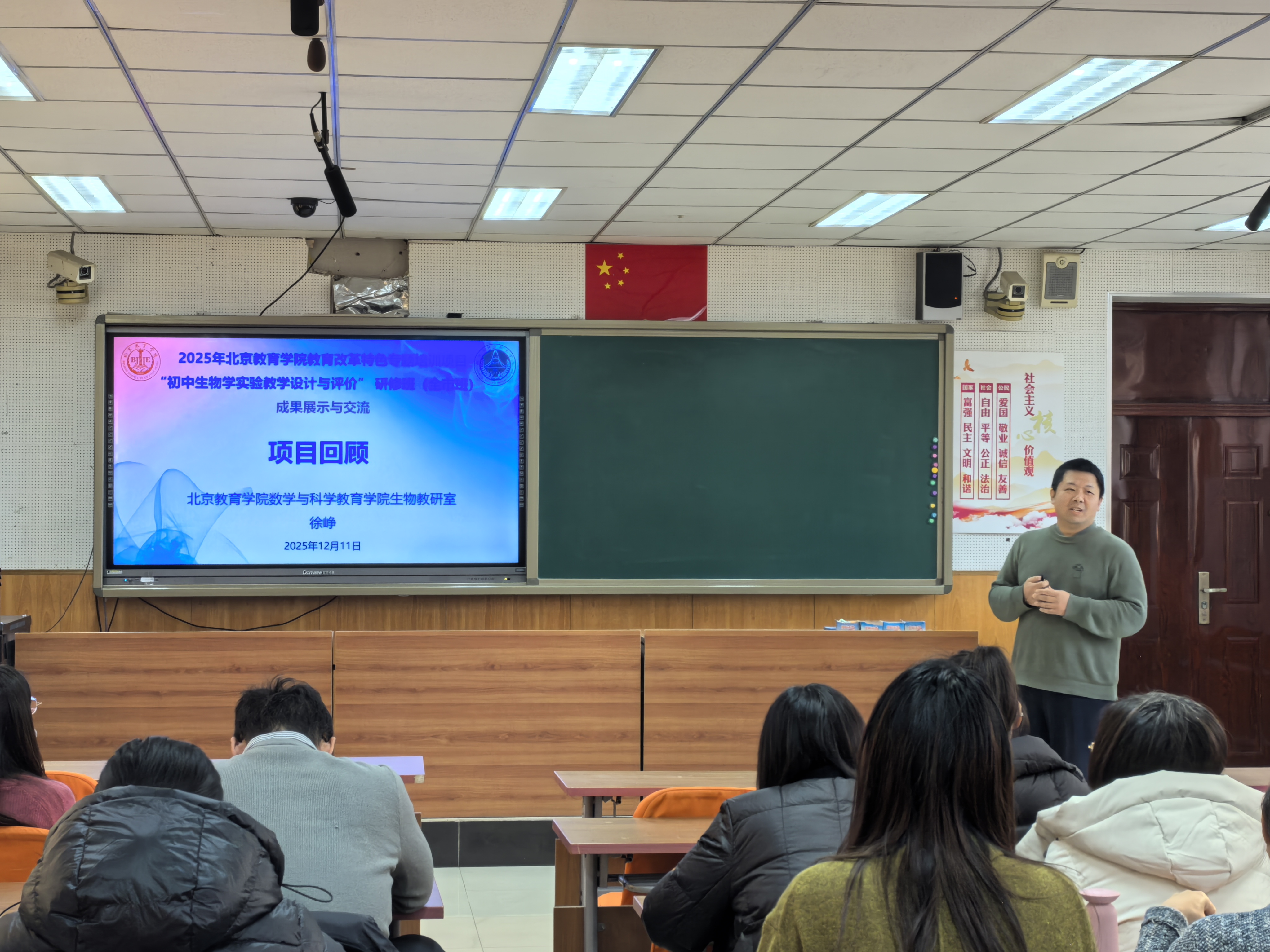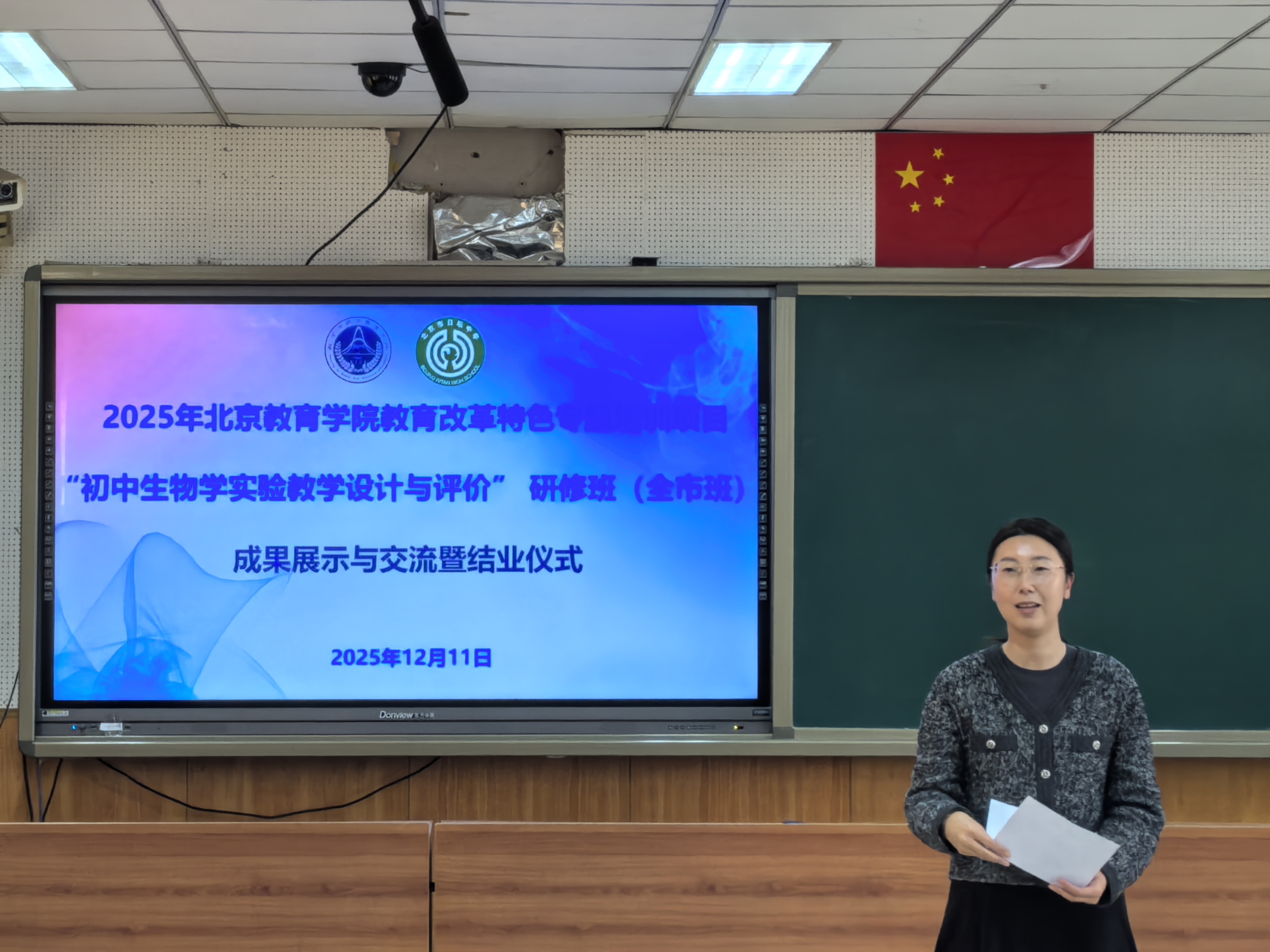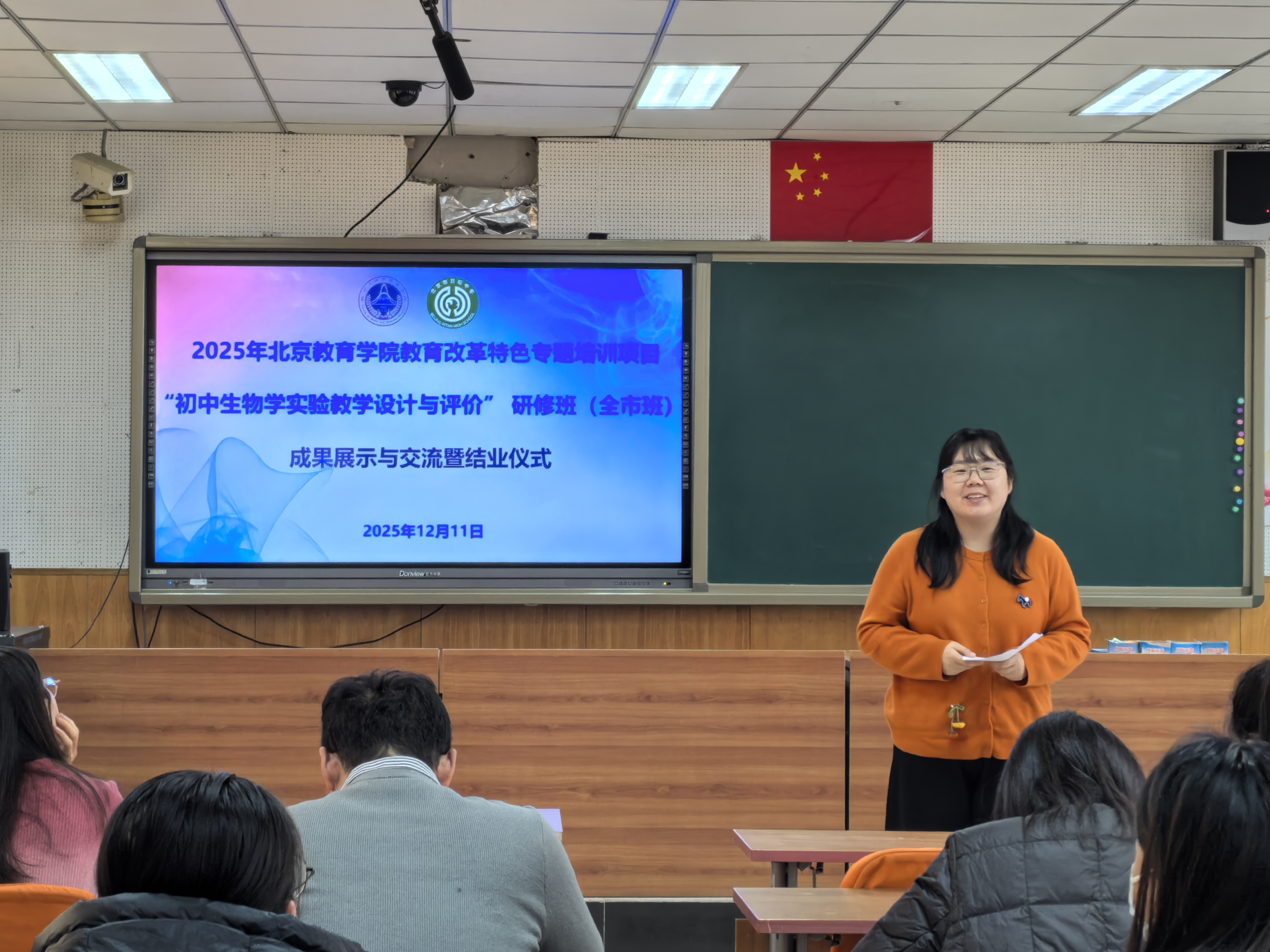 北京教育学院教育改革特色专题培训项目“初中生物学实验教学设计与评价”研修班(全市班)成果展示与交流暨结业仪式,于12月11日在北京市日坛中学举办。本次活动以深化初中生物学实验教学改革、推广优质教学实践经验为目标,通过教学观摩、成果分享、经验交流等形式,为全市参训教师搭建了互学互鉴、共同提升的平台。活动由项目负责人、数科学院生物教研室徐峥博士主持。