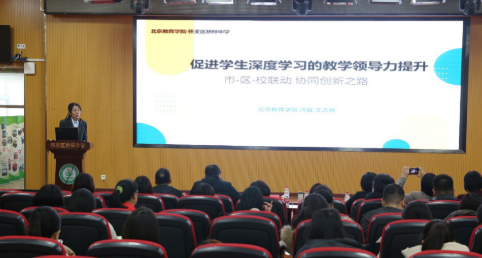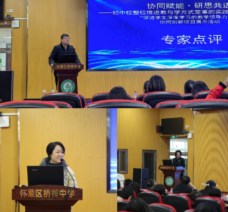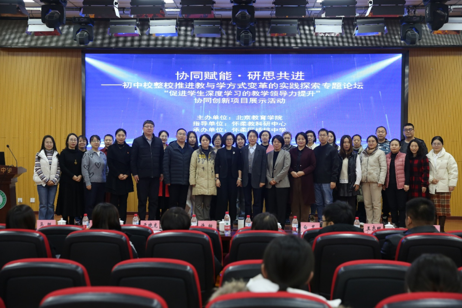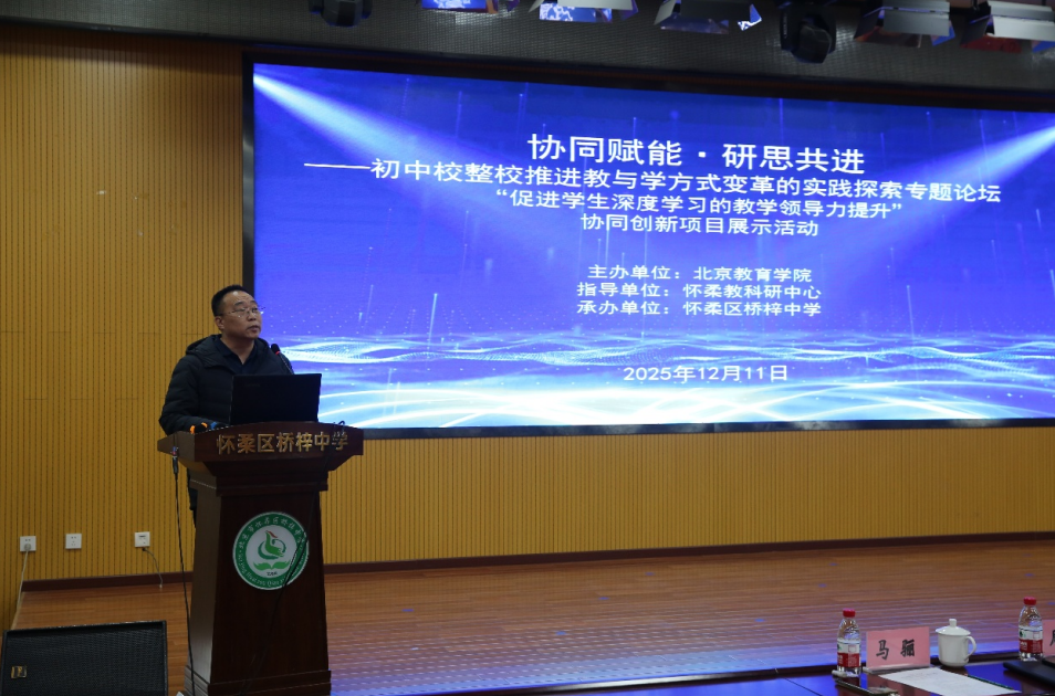 2025年12月11日,北京教育学院第三期协同创新学校计划“高质量教育导向的学校管理改进——促进学生深度学习的教学领导力提升”项目在怀柔区桥梓中学开展结业成果交流专题论坛。本次活动以“协同赋能、研思共进”为主题,北京教育学院教育干部学院项目团队、怀柔区教科研中心、全市各区兄弟学校的校长书记代表、教育期刊主编,以及桥梓中学的全体教师共同参加。
