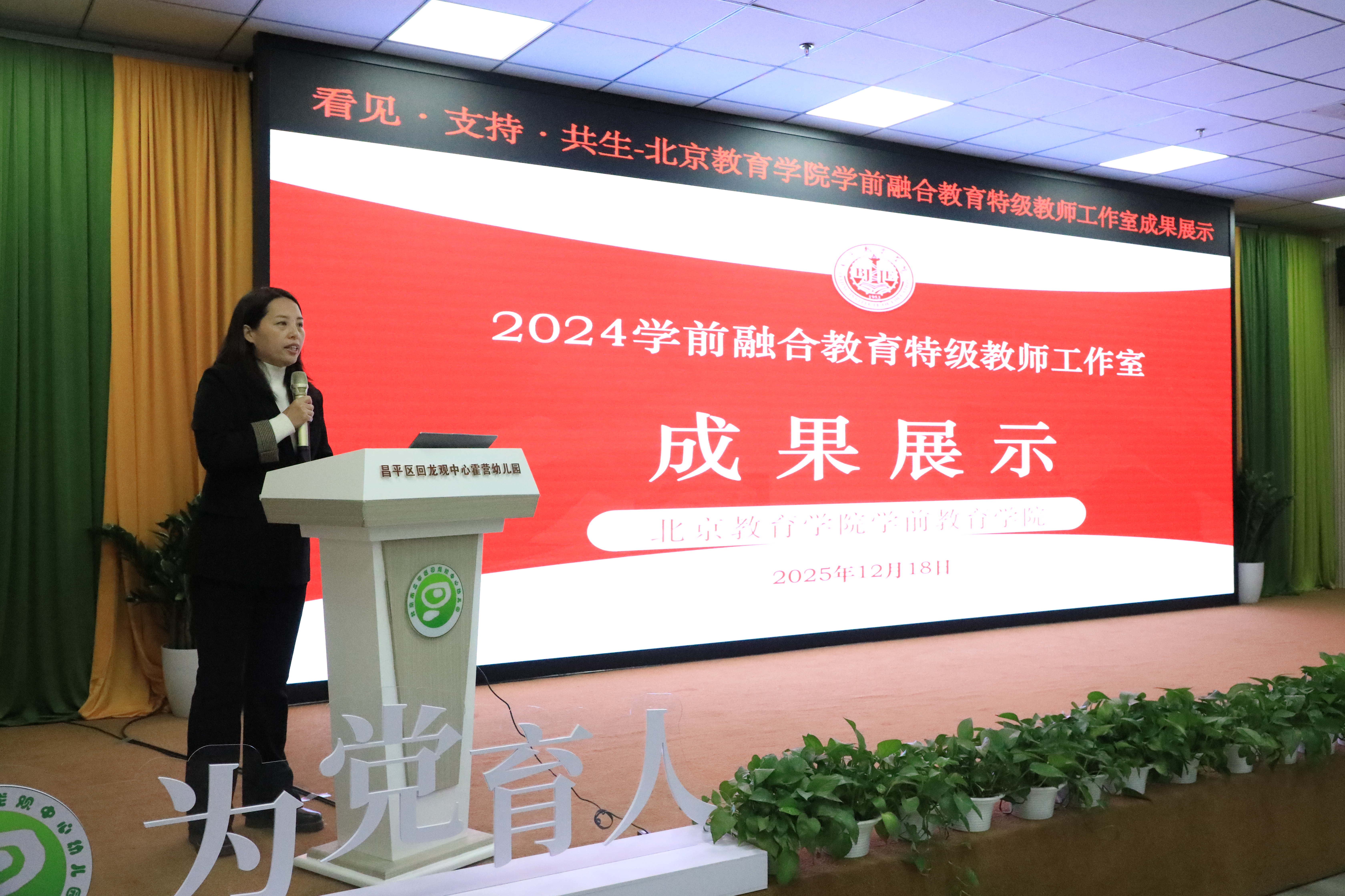 2025年12月18日上午,由北京教育学院学前教育学院主办,北京市昌平区回龙观中心霍营幼儿园承办的“看见·支持·共生——北京教育学院学前融合教育特级教师工作室成果展示活动”顺利举行。本次活动汇集了专家代表、2024年学前融合教育特级教师工作室成员、北京市幼儿园教研员研修项目学员、“3-6岁特殊儿童融合教育”学科创新平台成员和基地园代表,以及“学前融合教育研究中心”成员共60余人,共同研讨与展示学前融合教育特级教师工作室的丰厚研修成果,推动学前融合教育从理念到行动的深度落地。活动由学前教育学院教师、2024年学前融合教育特级教师工作室助理朱丽芳主持。
