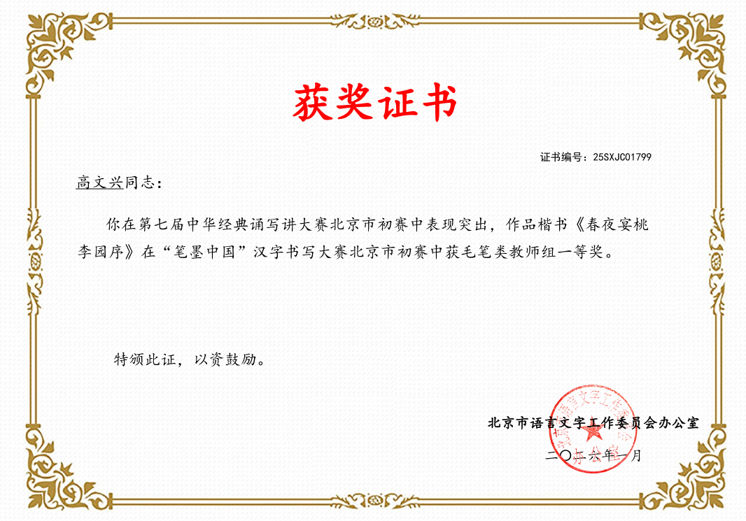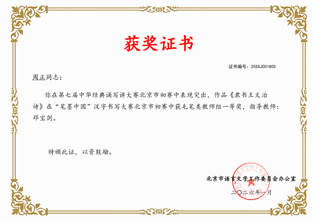 近日,北京市教育委员会公布了2025年北京市中华经典诵读工程系列活动暨第七届中华经典诵写讲活动初赛获奖名单,体育与艺术教育学院美术系书法专业青年教师周正、高文兴、朱惠龙斩获佳绩。在“印记中国”师生篆刻大赛中,周正荣获北京市初赛一等奖,朱惠龙荣获北京市初赛二等奖。在“笔墨中国”师生书法大赛中,周正、高文兴荣获北京市初赛一等奖。