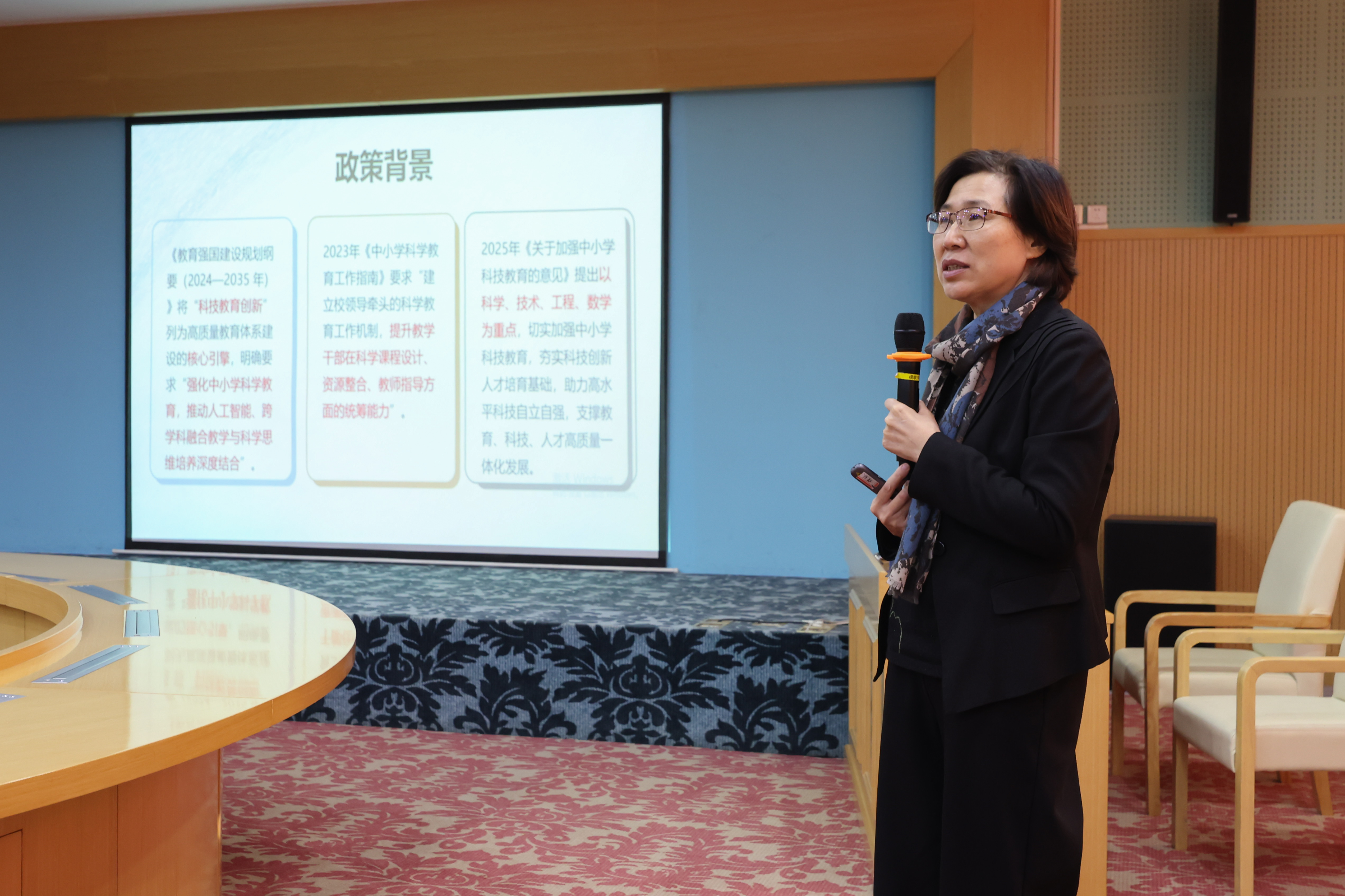 冯华教授系统解读了国家在“双减”背景下做好科学教育“加法”的战略意图与实践要求,深刻阐述了科学教育作为国家战略的育人价值。通过辨析“科学教育”(重在求真,探索自然规律)与“科技教育”(重在求实,创造解决方案)的内在联系与区别,帮助教师们厘清了二者相辅相成、共同服务于创新人才培养的定位。项目负责人周玉芝教授则将视野投向全球,介绍了以美国下一代科学教育标准(NGSS)三维框架(学科核心概念、跨学科概念、科学与工程实践)为代表的国际科学教育发展趋势,并结合“认识安全气囊”等生动课例,展示了如何通过基于现象的学习和STEM学习,实现跨学科整合与素养落地。