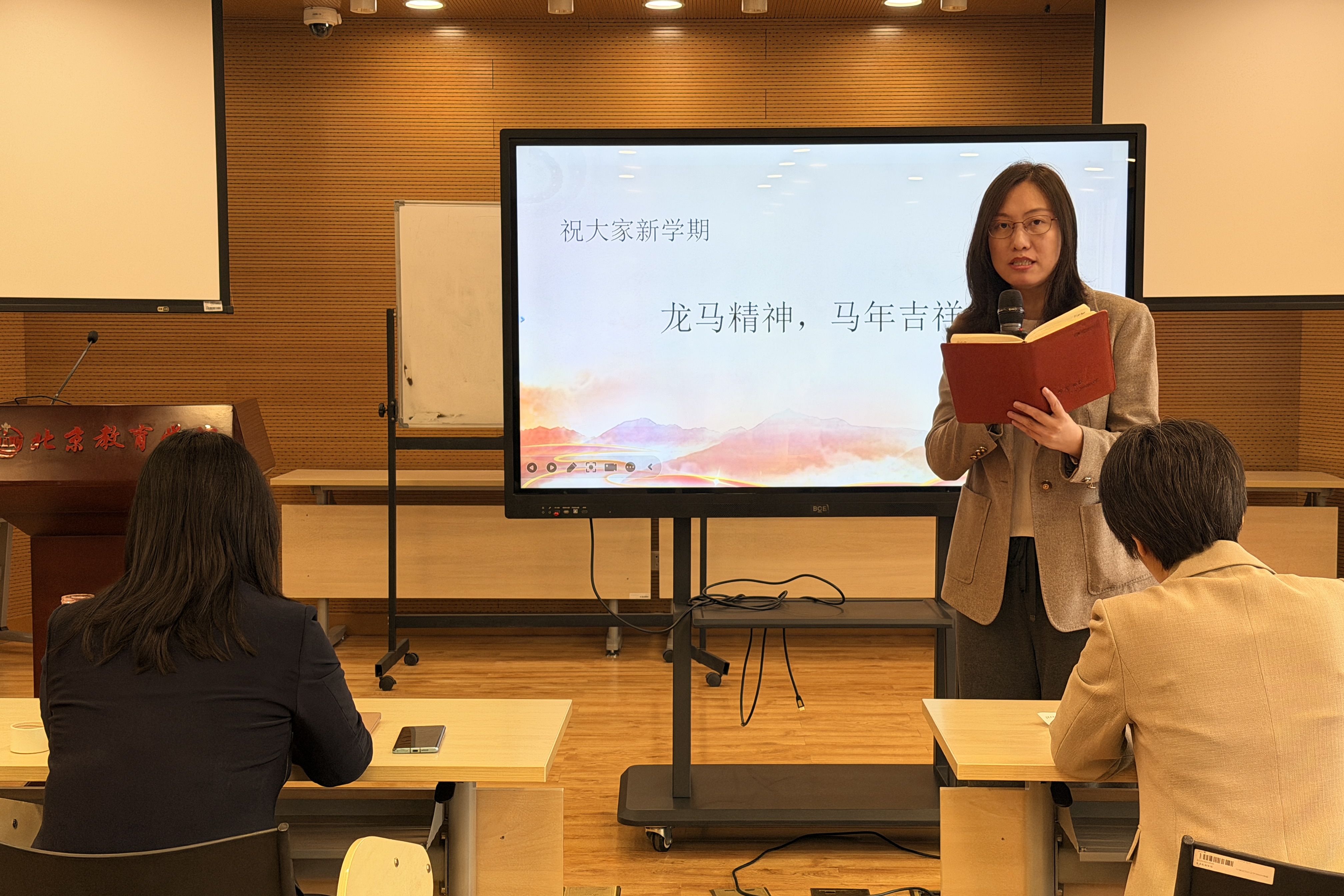 李淑君书记带领全体教职工深入学习习近平总书记考察北京时的重要讲话精神。她首先系统梳理了党的十八大以来习近平总书记对北京历次考察情况以及核心要求,让大家对总书记关于北京“四个中心”功能和京津冀协同发的战略定位,从战略构思到蓝图落地,以及高质量发展的时间轴有了比较清晰的认识。然后她带领大家重点学习了总书记2月9、10日在北京考察时的讲话精神。习近平总书记在“十五五”开局之年,首选北京考察调研,体现了对北京工作的高度重视,同时也给予了更高期待、提出了更高要求,希望北京在全国2035年基本实现社会主义现代化中发挥示范作用。李淑君书记强调,全体教职工要深刻认识此次考察对首都发展的重要性,自觉维护和践行北京“四个中心”定位和京津冀协同发展的战略要求,主动思考在教育科技人才一体化推进与京津冀协同发展战略背景下,教师培训工作的发力点,切实将习近平总书记的讲话精神融入工作实践。