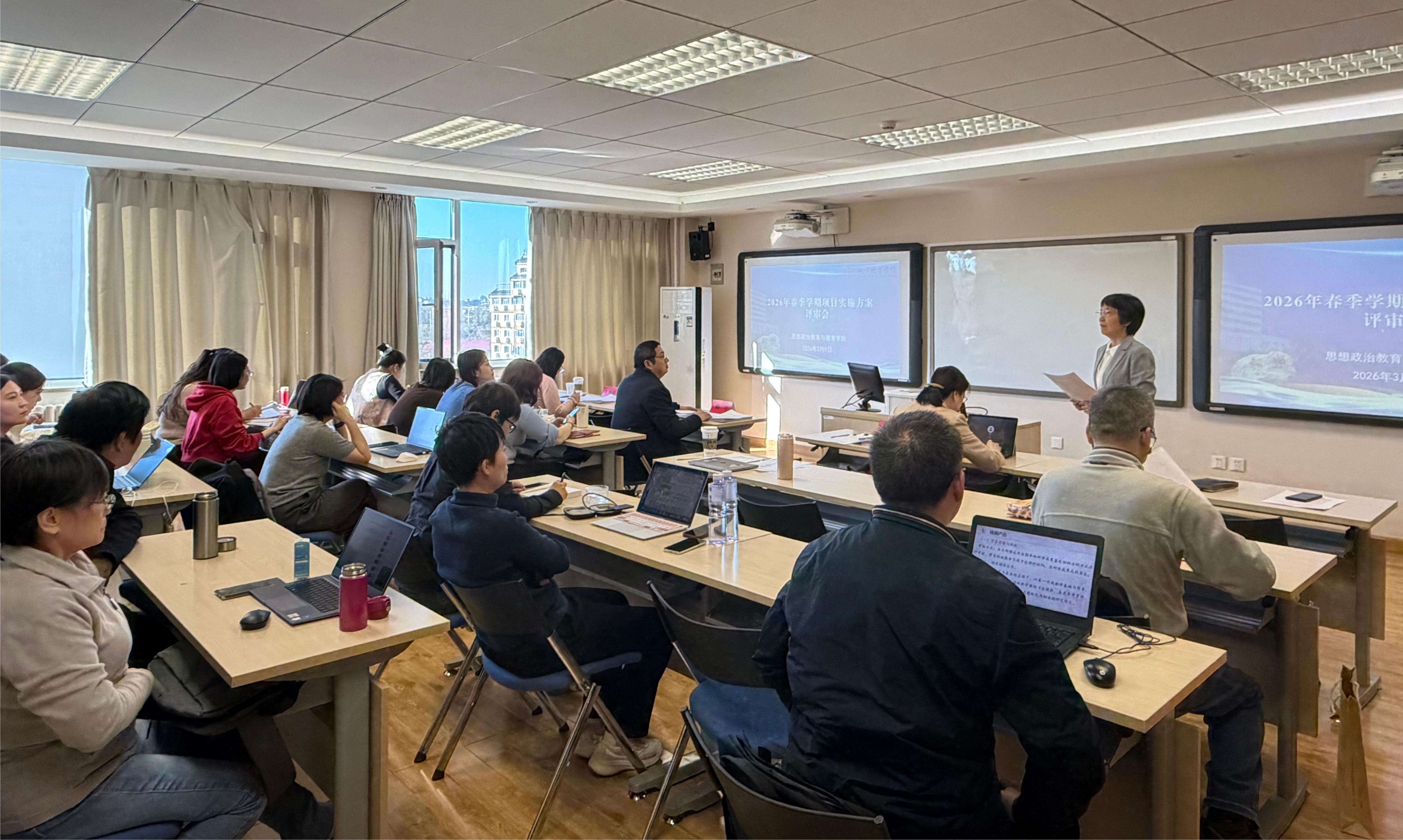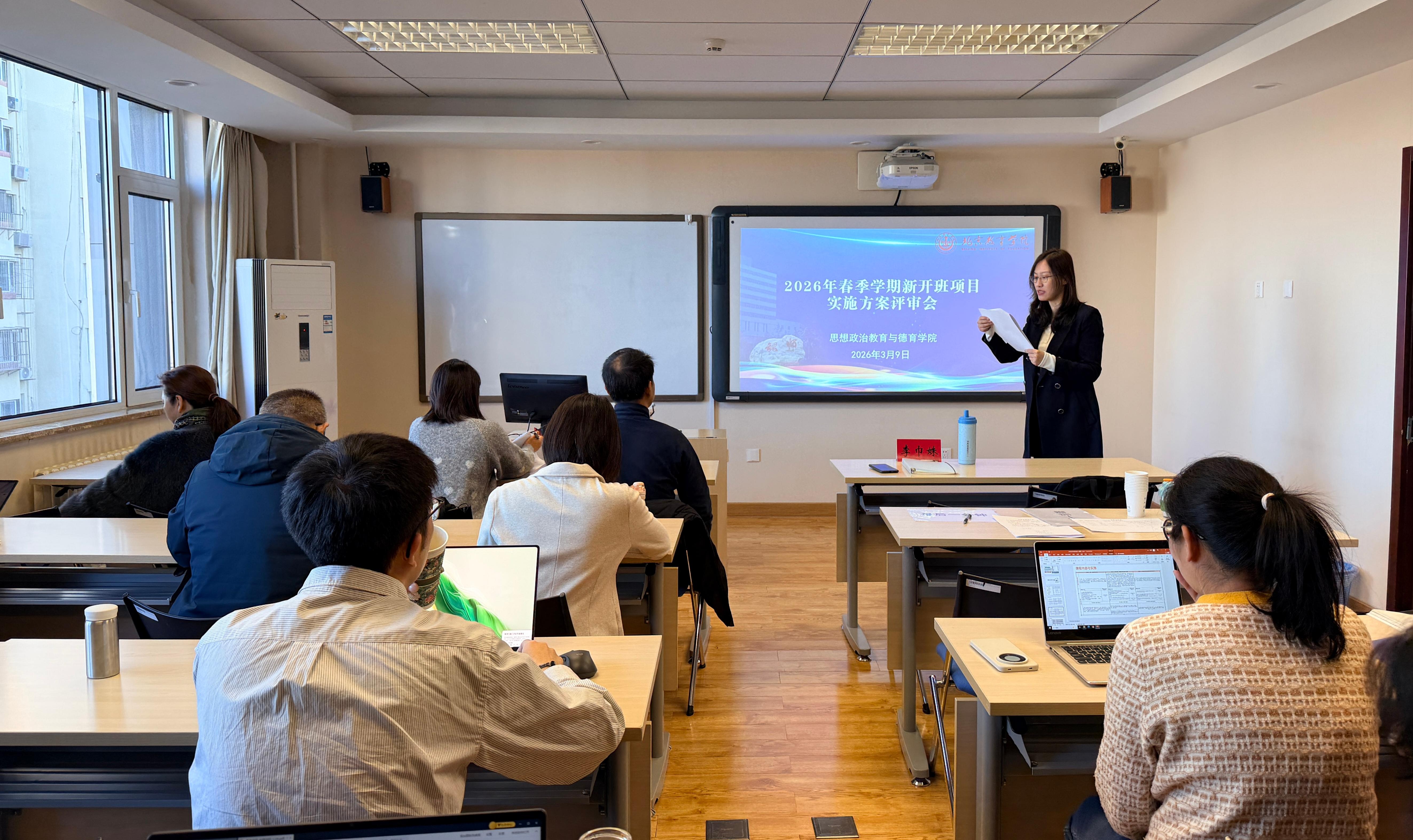 按照学院教学工作安排,思想政治教育与德育学院于3月9日召开2026年春季学期新开班培训项目实施方案评审会,邀请北京师范大学、首都师范大学、中国青年政治学院、朝阳区教育科学研究院等单位九位专家对26项培训项目进行了实施方案评审。教务处干部丁国英到会指导,思政学院全体教职工参会。
