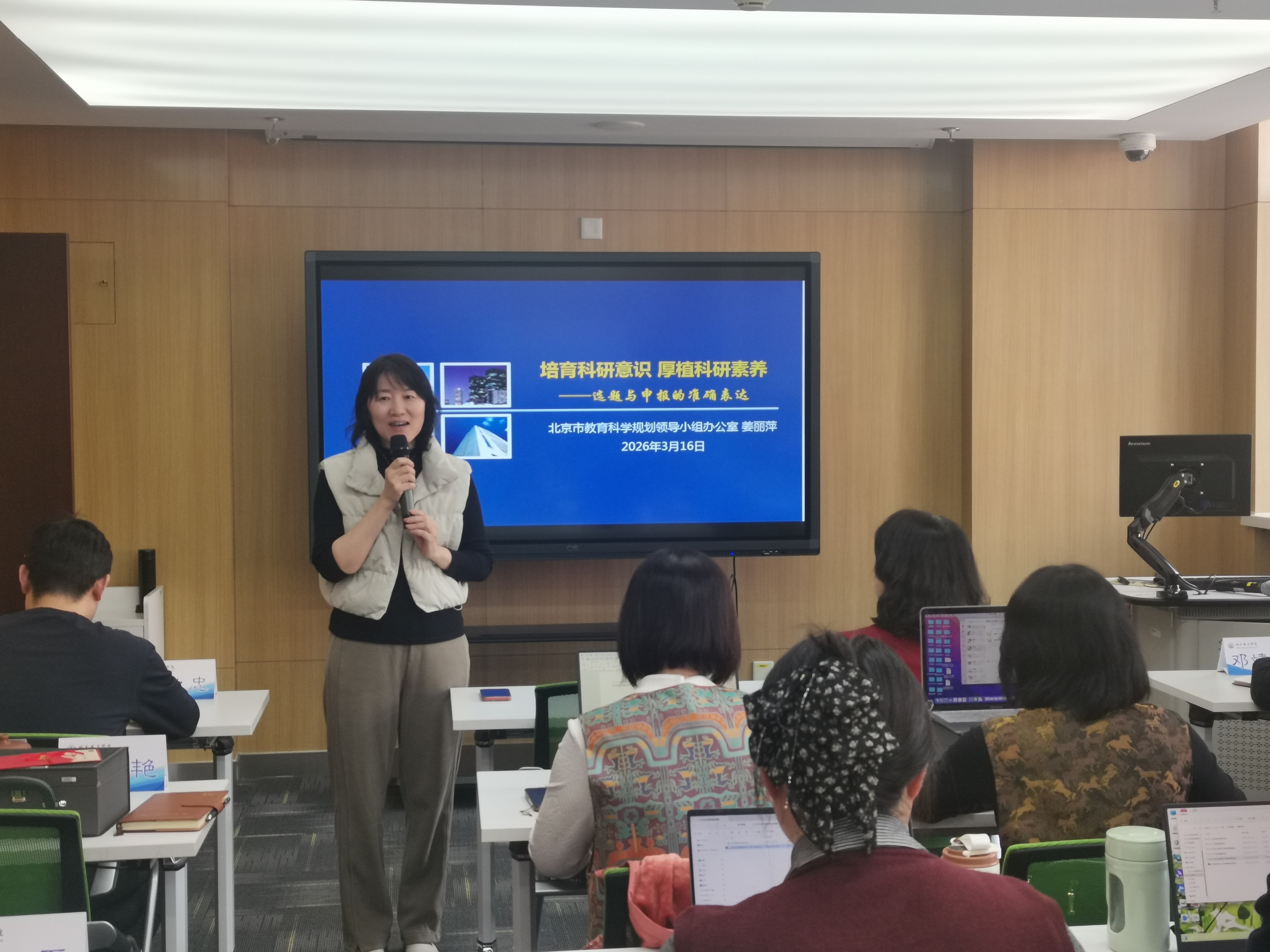 为持续深化有组织科研建设,全面提升教师课题申报质量,助力教师专业发展与学术研究能力提升,数学与科学教育学院于 3 月 16 日下午召开课题申报指导专题讲座。本次讲座特邀北京市教育科学规划领导小组办公室主任姜丽萍研究员主讲,数科学院副院长刘春艳主持会议。