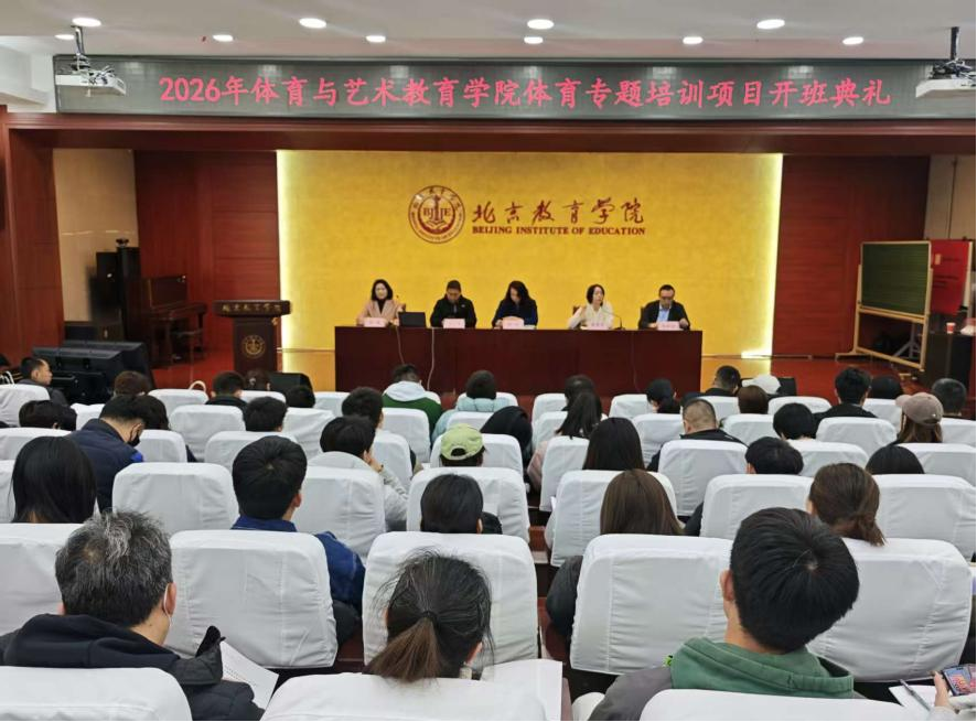 2026年3月18日,北京教育学院体育系2026年专题培训项目开班典礼在北京教育学院黄化门校区隆重举行。本次培训紧紧围绕“健康第一”教育理念,深度契合新时代学校体育改革发展要求,聚焦中小学体育教学提质增效、学生体质强健提升与体育教师专业素养发展三大核心目标,以系统化设计、专业化引领、精准化赋能,助力首都学校体育教育高质量发展,为培养新时代全面发展人才筑牢体育根基。开班典礼由体育与艺术教育学院副院长赵楚主持,奥运会跆拳道冠军陈中、学院党总支书记周志勇、院长潘建芬、副院长赵苏杭、体育系主任胡峰光,以及体育系项目团队、来自全市各区的近200名参训学员共同出席了本次活动。