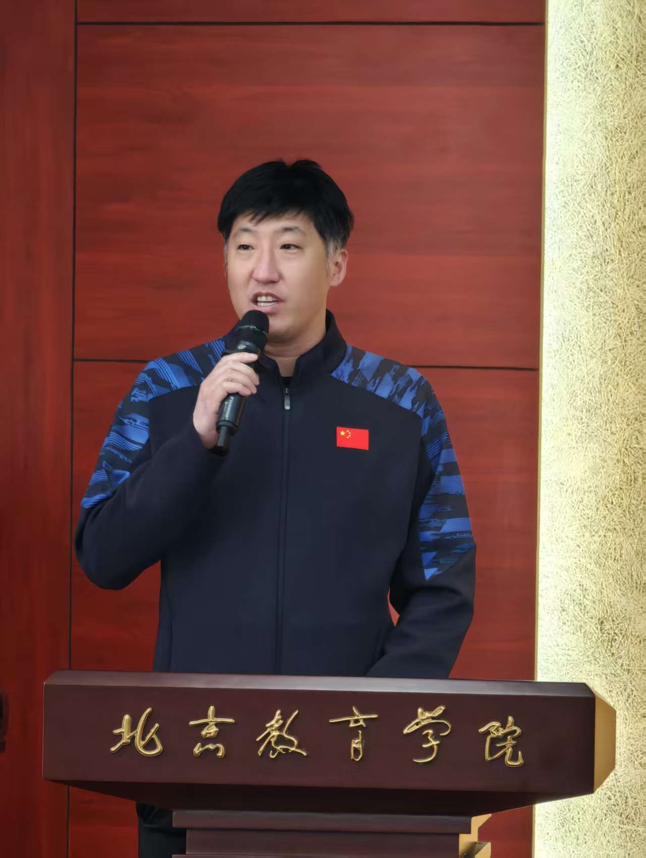 学员代表、北京市第八十中学管庄分校李博老师上台发言。他首先向北京教育学院体育与艺术教育学院搭建的优质学习平台表示衷心感谢,随后结合教育部“健康第一”教育理念与“十五五”规划开局的时代背景,深刻阐述了体育教育“以体育人、以体润心、塑造健全人格”的重要意义。他代表全体参训学员作出郑重表态:将以此次培训为契机,潜心研学、勤于思考,立足教学实践、勇于探索创新,主动加强同行间的交流协作、协同共进,以首善标准践行体育育人使命,切实把所学知识运用到日常教学中,为促进学生身心健康发展、培养担当民族复兴大任的时代新人贡献体育教师的力量。