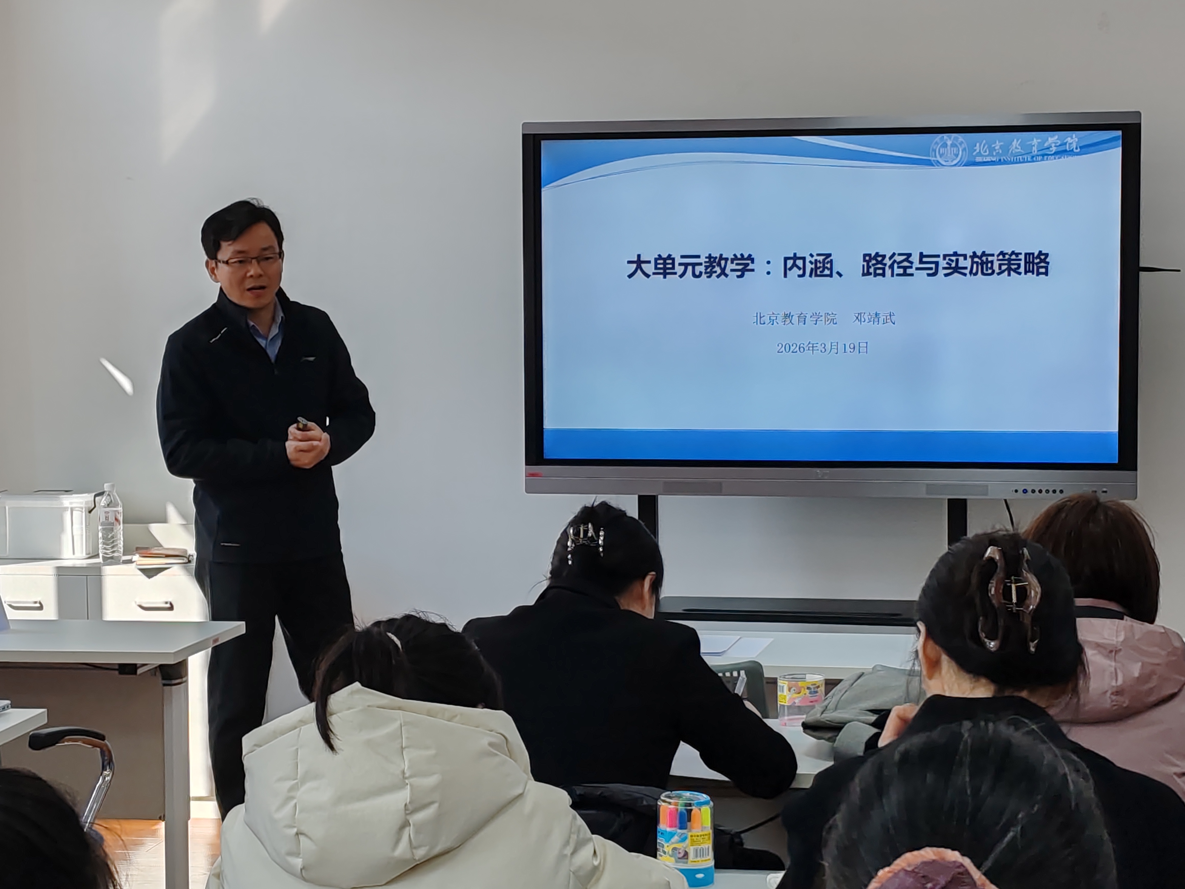 开班仪式后,邓靖武院长为全体学员作了题为“大单元教学:内涵、路径与实施策略”的专题讲座。他从政策背景、课改要求与学生需求三个维度系统阐述了单元教学的必要性,并结合自身丰富的一线教学经验与教师培训经历,梳理了单元教学的具体实施路径与教学策略,为后续学员借助生成式人工智能工具开展单元教学奠定了坚实基础。