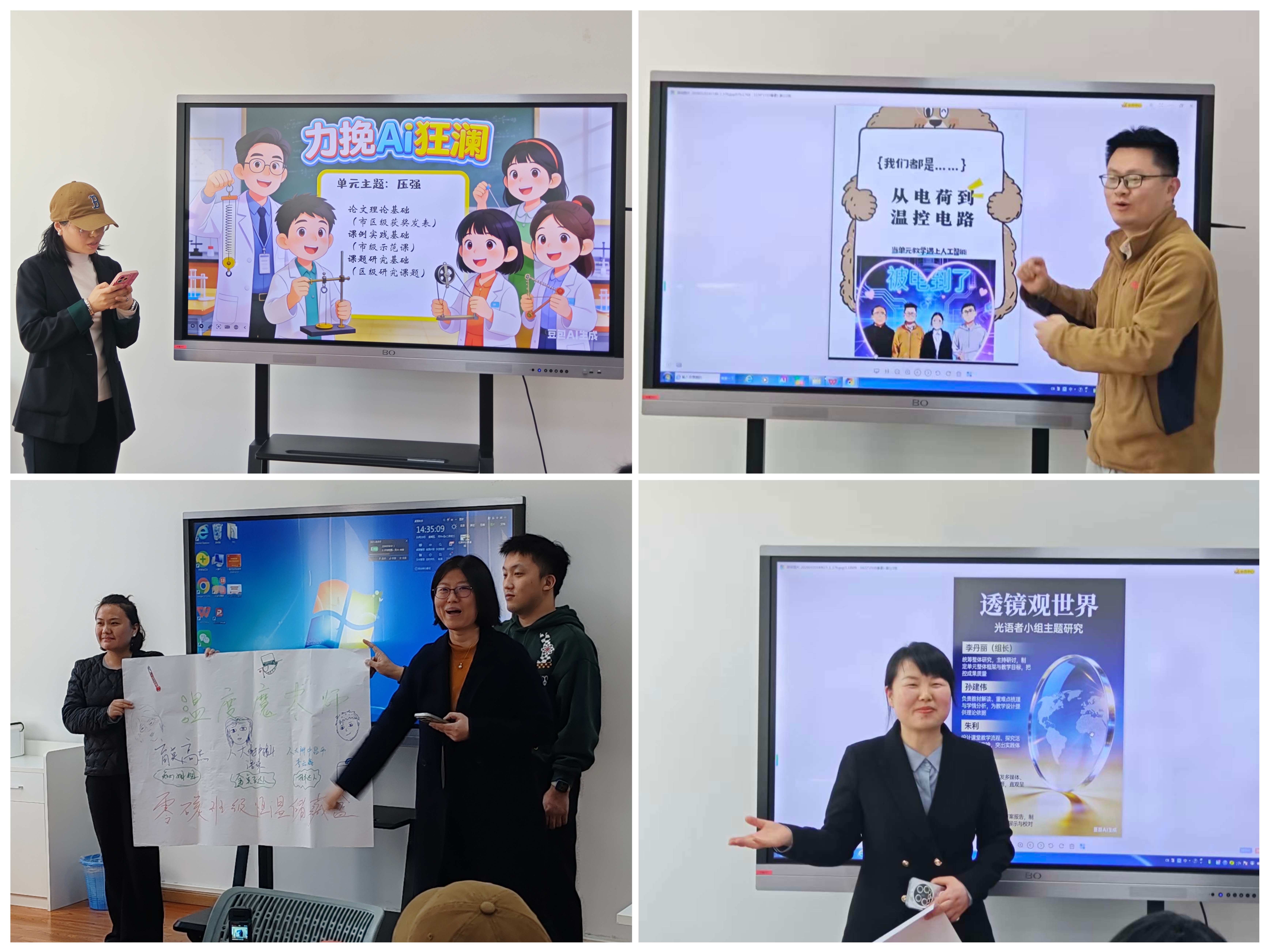 下午的研修活动中,学员教师按“力学”“电学”“热与物质”“光与信息”四个教学单元组建小组,借助生成式人工智能工具,初步体验了物理单元教学的选题与要素设计。在展示交流环节,各小组通过AI海报展示合作成果与单元教学设想。学员们结合自身教学实践,展示了VR仿真物理实验、电路自动控制模块等数字化手段在物理实验教学中的创新应用。