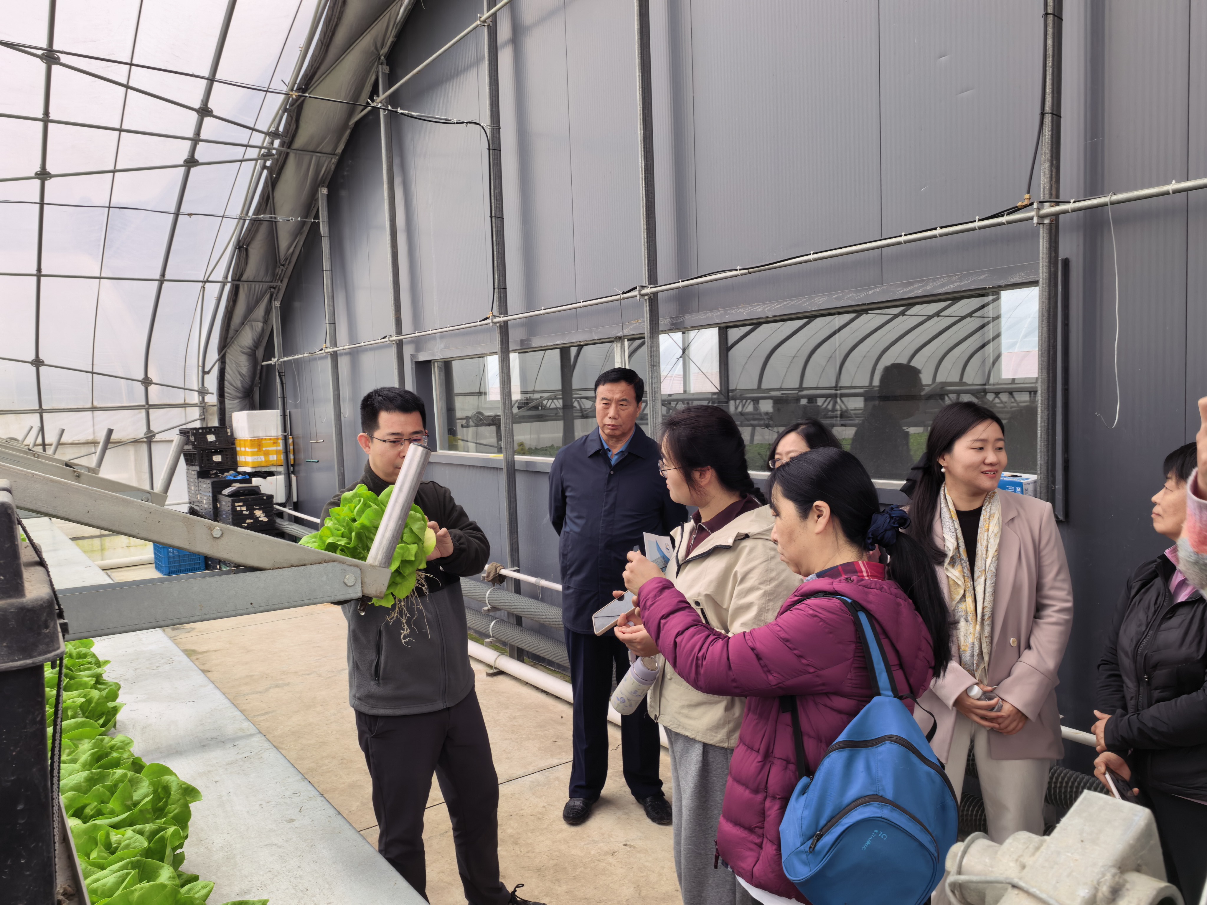 考察中,科普教育负责人王秀春详细介绍了中心功能定位、创新体系及示范园区布局,为STEM教育产教研融合搭建了清晰的资源框架。京瓦执行主任郭斗斗博士带领考察团实地参观,重点讲解中心智慧农业技术、科创项目及连栋温室等实践场景,为教师科技教育教学提供了前沿技术支撑。