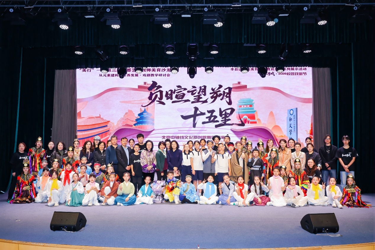 戏剧教学成果展示环节由北京市丰台区和义学校星光剧社带来以北京中轴线文化为主题的原创歌舞剧《负暄望朔十五里》。该剧社由4—8年级戏剧爱好者组成,学生们舞台表现自信从容、情感真挚饱满,将文化底蕴与戏剧艺术表达深度融合,充分展现学校戏剧教育的扎实成效与育人成果,赢得全场热烈掌声。