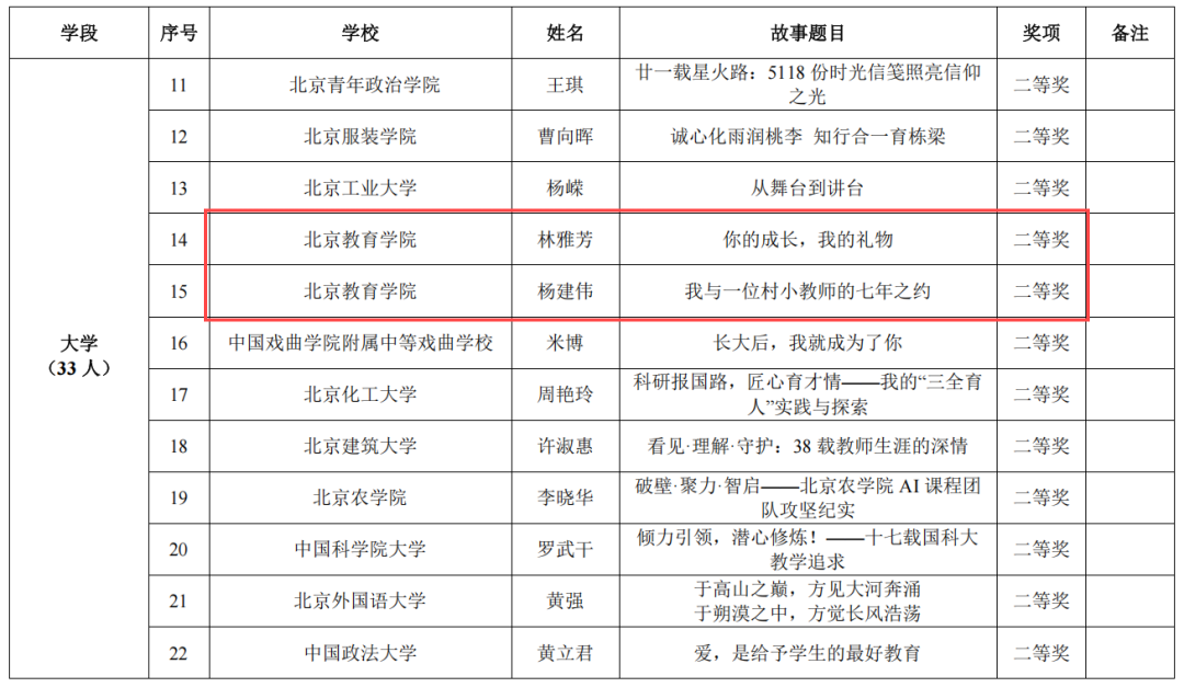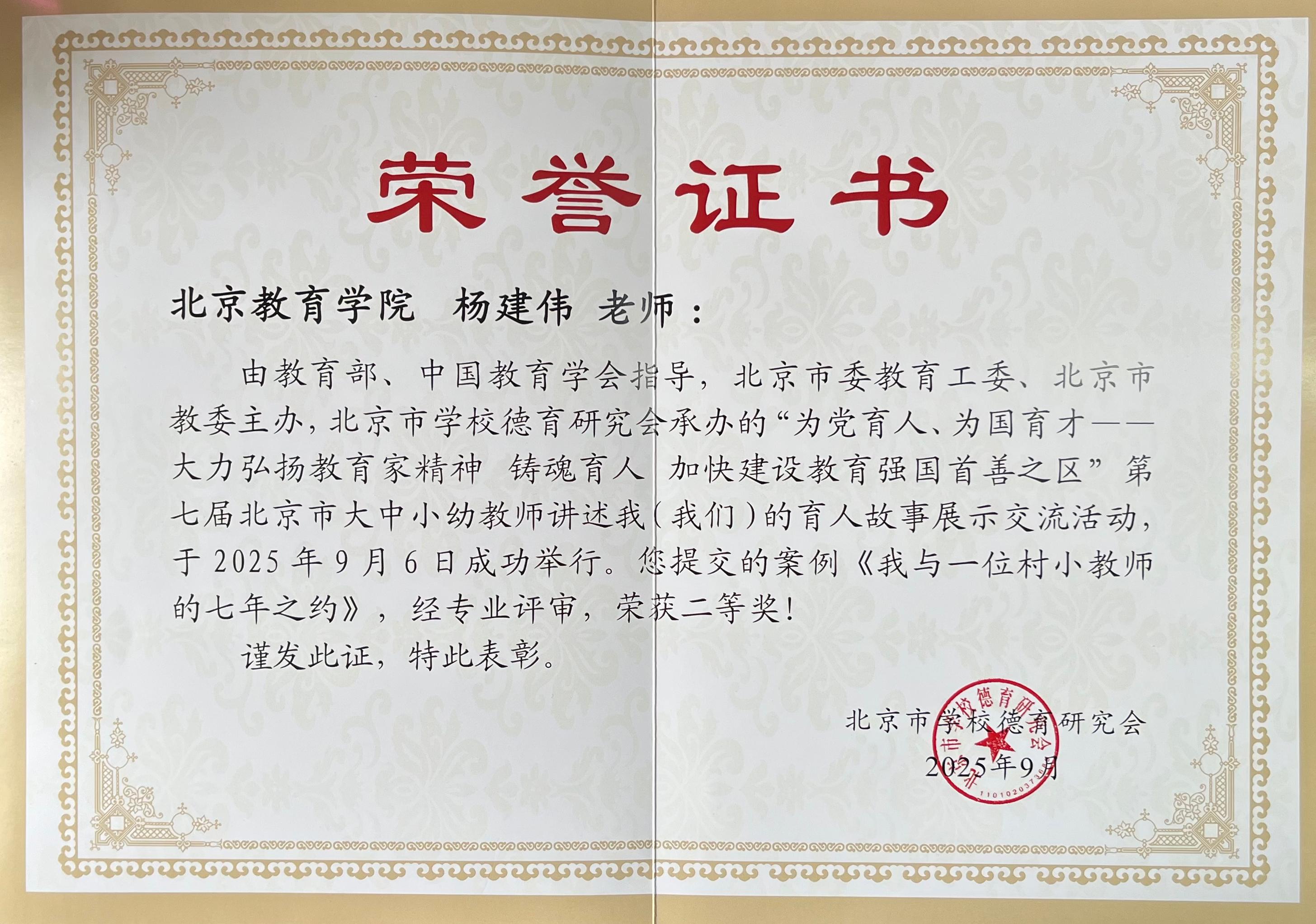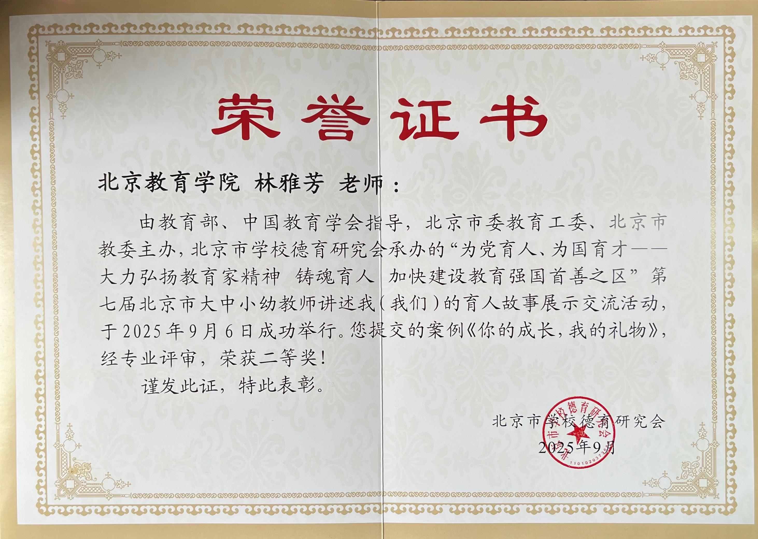 近期,由教育部、中国教育学会指导,北京市委教育工委、北京市教委主办,北京市学校德育研究会承办的“为党育人 为国育才——大力弘扬教育家精神 铸魂育人 加快建设教育强国首善之区”第七届北京市大中小幼教师讲述育人故事展示交流活动举行。经组委会专业评审,我院思想政治教育与德育学院林雅芳老师与信息科技教育学院杨建伟老师荣获优秀育人故事案例二等奖。