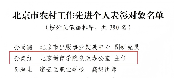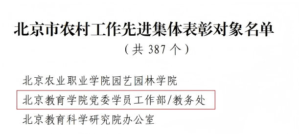 近期,中共北京市委农村工作领导小组办公室、中共北京市委农村工作委员会、北京市农业农村局、北京市发展和改革委员会、北京市粮食和物资储备局、北京市人力资源和社会保障局等部门联合印发《关于表彰北京市农村工作先进集体和先进个人的决定》,全市评选表彰387个北京市农村工作先进集体、380名北京市农村工作先进个人。我院党委教师学员工作部/教务处荣获“北京市农村工作先进集体”称号,党政办公室孙美红同志荣获“北京市农村工作先进个人”称号。
